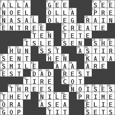 ACROSS 1. Silent film actress Nazimova 5. Unit of force equal to gravity 8. Perceive with the eye 11. Christmas carol 12. Water jar 14. Before (prefix) 15. Rhinal 17. Cassini of fashion 18. Water falling in drops from the sky 19. Main course 21. Cause to be 23. Nine, plus one 25. Wig 26. Small island 27. Elected rep. 28. A female animal or person 31. Attila the _ 33. Fast jet (abbr.) 35. Being in motion 37. Emitted 38. Layer 40. Polynesian shrub of the pepper family 41. Grin 43. American Automobile Association (abbr.) 45. "We ___ not amused" (Victoria) 46. Eastern Standard Time (abbr.) 47. Male parent 50. Relief 52. Become fatigued 53. Small bed 54. Threesomes 56. Annoying sounds 61. Those things 62. The longest river in the world 65. A-one 66. Mouth or opening 67. Toward the sea 68. Writer Wiesel 69. Republican Party 70. Teat (slang) 71. Puts into a specified state DOWN 1. Queen of England 1702-14 2. Grant temporary use of 3. For fear that 4. Having or resembling wings 5. Thick or sticky substance 6. Pipe bend 7. Opts 8. Petty quarrel 9. One of the Great Lakes 10. Car or cant ending 13. Match 16. Allows 18. Actress Charlotte 20. Snakelike fish 22. Inactive volcano in Sicily 24. Delicate 26. International (abbr.) 28. Play the lead 29. Hub of activity 30. Epoch 31. Equivocates 32. A single undivided whole 34. Afternoon social gathering 36. Three-handed card game 37. Compass dir. 39. Drug cop 42. Singer Brickell 44. A really long time 48. Sports stadium 49. Cease 51. Halt 52. Attempt 54. Through, poetically 55. Pile 57. Angers 58. Drop; flow; fall 59. Give off 60. Perceives with the eye 61. Coat; cloak 63. Flowery wreath 64. Erode