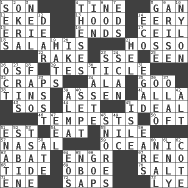 ACROSS 1. Manchild 4. Prong on a fork 8. Separate the seeds from cotton 11. Supplemented with great effort 13. Parka part 14. Suggestive of the supernatural 15. One of the Great Lakes 16. Conclusions 17. To provide with a ceiling 18. Deli grouping 21. With motion or animation 22. Immoral or dissolute person 23. Compass dir. 25. Car or cant ending 26. Order of Saint Francis (abbr.) 29. A testis 32. Dice game 34. In the manner of 35. Thick or sticky substance 38. Canisters 39. NE Netherlands city 41. Silent film actress Nazimova 43. Mayday 44. Allow 45. Perfect 46. Storms 50. Often (poetically) 51. Eastern Standard Time (abbr.) 54. Ingest 55. "Death on the ____" 57. Relating to the nose 59. Pertaining to the sea 63. Blind as ____ 64. Engineer (abbr.) 67. Former U.S. Attorney General Janet 68. Event that recurs at intervals 69. Mitch Miller's instrument 70. Table seasoning 71. Compass dir. 72. Plant excrements 73. Sodium hydroxide DOWN 1. Perceives with the eye 2. Gumbo ingredient 3. Famous astronaut Armstrong 4. College papers 5. Electrically charged atom 6. Lower and raise head in agreement 7. Begley and Asner 8. Honkers 9. Ascend 10. Thermoplastic polyamide 12. Letter starter 14. Environmental prefix 19. Floor coverings 20. Eisenhower's nickname 21. Cartoonist voice _ Blanc 23. Filth; sediment 24. Examine hastily 26. Sep. follower 27. Indian titles of respect 28. Papal veil 30. Clothes sense 31. Mild oath 33. Inconspicuous attention getter 36. Margarine 37. Norwegian king 39. _ mater 40. Back-to-school mo. 42. The first octave above the treble staff 45. Small island 47. Snakelike fish 48. Sounds asleep 49. Nervous spasm 51. Related on the mother's side 52. Unit of acoustic absorption 53. Sadhe (variant) 56. Hearing organs 58. Had dinner 60. Be tempered by heat 61. Inwardly 62. ____ d'Azur (French Riviera) 64. Greek goddess of the dawn 65. Basketball assoc. 66. Republican Party