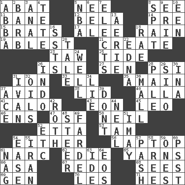 ACROSS 1. Blind as ____ 5. Born 8. Observe 11. Object of repulsion 12. Actor Lugosi 14. Before (prefix) 15. Naughty children 17. Toward shelter 18. Water falling in drops from the sky 19. Most capable 21. Make 23. The 23rd letter of the Hebrew alphabet 25. Event that recurs at intervals 26. Small island 27. Elected rep. 28. Air pressure measure (abbr.) 31. Electrically charged atom 33. Pipe bend 35. At full speed 37. Enthusiastic 38. Flaplike covering 40. Silent film actress Nazimova 41. Bodily heat indicating an inflammation 43. Period of immesurable duration 45. Lion 46. Followers of ems 47. Order of Saint Francis (abbr.) 50. Famous astronaut Armstrong 52. Singer James 53. Scottish cap 54. One or the other of two 56. Portable computer 61. Drug cop 62. Singer Brickell 65. Entertaining tales 66. White ___ sheet 67. Do over again 68. Observes 69. Commissioned mil. rank 70. French article 71. Command DOWN 1. Swedish rock group 2. Sharp remark 3. Of or related to the anus 4. False hair 5. Basketball assoc. 6. Snakelike fish 7. Chooses 8. Argument over a trivial matter 9. One of the Great Lakes 10. Car or cant ending 13. Nest on high 16. Fast planes 18. Actress Charlotte 20. Story 22. Pulitzer Prize-winning author Ferber 24. Not ill 26. _ china 28. Light colored 29. Grain storage tower 30. _ tizzy (2 wds.) 31. "Terrible" tsar 32. Lubricates 34. Untruth 36. Shopping center 37. Adept person 39. Do not 42. Writer of Portnoy's Complaint (1969) 44. Actress Patricia 48. Navigate 49. Burden 51. "If ____ say so..." 52. And so on (abbr.) 54. Comfort 55. SW Asia republic 57. Romantic infatuation 58. Woody plant 59. Singles 60. Inconspicuous attention getter 61. Tired old horse 63. Binary compound 64. Greek goddess of the dawn