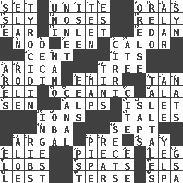 ACROSS 1. Put into a specified state 4. Join together 9. Mouths or openings 13. Secret 14. Olfactory organs 15. Have trust in 16. Ewer handle 17. An arm off of a larger body of water 18. Dutch treat 19. Allow head to fall sleepily 21. Car or cant ending 22. Bodily heat indicating an inflammation 24. Penny 26. ___ a Wonderful Life 27. N. Chile seaport 29. Relationship diagram 30. "The Thinker" sculptor 31. Arab leader 33. Scottish cap 36. Connecticut Ivy Leaguer 37. Pertaining to the sea 40. Insect wing 41. Elected rep. 42. High mountains 43. Small island 45. Charged atoms 47. Falsehoods 48. Basketball assoc. 49. Back-to-school mo. 50. Therefore, facetiously 52. Before (prefix) 54. Declare 56. Writer Wiesel 57. Component 59. Part of a journey 61. Tennis shots 62. Arguments over trivial matters 63. Raised railways 64. For fear that 65. Laconic 66. Health resort DOWN 1. Compass dir. 2. Liveliness 3. Polypeptide antibiotic 4. Corn or form start 5. Music written for nine 6. Small island 7. Adolescent 8. Eastern Standard Time (abbr.) 9. Threatening words 10. Make new 11. Having or resembling wings 12. Symbol (abbr.) 20. Tenth: prefix 22. High-altitude cloud 23. Had dinner 25. Billionth: prefix 27. Ancient Greek god of war 28. Hero or heavy, e.g. 29. Metal containers 31. Snakelike fish 32. Atlas unit 33. Baron Munchausen's specialties 34. Toward shelter 35. Floor protectors 38. Lessep's creation 39. Quote 44. Plant excrements 45. Eat 46. Chief or king in Benin or Nigeria 49. Religious groups 50. Medicinal plant 51. Chest bones 52. Corncob 53. Located in or toward the back 55. Sharp bark 56. Pipe bend 57. Pacific Standard Time (abbr.) 58. Compass dir. 60. Girls' org. (abbr.)