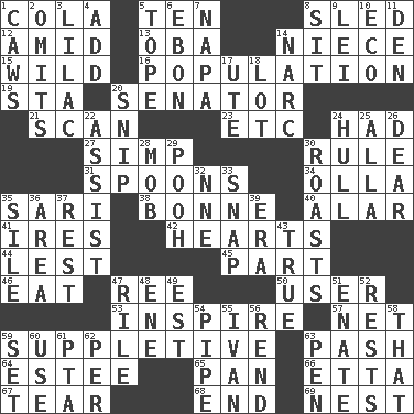 ACROSS 1. Root beer relative 5. "___ Little Indians" 8. Downhill vehicle 12. Among 13. Chief or king in Benin or Nigeria 14. Sibling's daughter 15. Rampant 16. Census information 19. R.R. building 20. Elected representative 21. Glance over 23. And so on (abbr.) 24. Possessed 27. Simple or foolish person 30. Court order 31. Soup utensils 34. Water jar 35. Indian skirt 38. Maid-servant 40. Having or resembling wings 41. Angers 42. Centers 44. For fear that 45. Role in a play 46. Erode 47. To separate or throw off 50. One who uses or employs something 53. Stimulate to action 57. Remaining after all deductions 59. Supplying deficiencies 63. Romantic infatuation 64. First name in cosmetics 65. Baking dish 66. Singer James 67. Pull apart 68. Conclusion 69. Egg locale DOWN 1. Crow sounds 2. Leaves out 3. Pale purple color 4. Say or write further 5. Drink excessively 6. Inky black, to poets 7. California wine valley 8. Be seated 9. Flowery wreath 10. Environmental prefix 11. Lair 14. Drug cop 17. Shoshoni 18. Car dealer's back yard 20. Sever or remove by pinching or nipping 22. Help 24. Frame or body of a ship 25. Silent film actress Nazimova 26. Letter starter 28. Crowd into 29. "Silly old bear" 30. Cooks with dry heat, as in an oven 32. Compass dir. 33. Fastener 35. Drop; flow; fall 36. Type of rug 37. Relief 39. Period 43. Loyal 47. Cause heat under the collar 48. Compass dir. 49. Eastern Standard Time (abbr.) 51. Maternal 52. Musical pauses 54. Corncob 55. "Terrible" tsar 56. Tear apart 58. Not this but _ 59. Arrange properly for use 60. Purpose 61. Parent Teacher Association (abbr.) 62. For each 63. Fenced enclosure