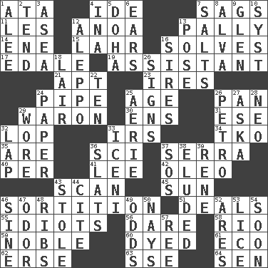 ACROSS 1. _ moment's notice (2 wds.) 4. Binary compound 7. Droops 11. French article 12. Small Philippine buffalo 13. Friendly 14. Compass dir. 15. Cowardly lion portrayer 16. Finds the solution 17. Peak District village in England 19. Helper 21. Fitting 23. Angers 24. Corncob 25. Mature 26. Baking dish 29. Make _____ (do battle with) 30. Followers of ems 31. Compass dir. 32. Trim (branches) 33. Big collection agency 34. Ring climax 35. "We ___ not amused" (Victoria) 36. _-fi 37. Spanish missionary in California 40. For each 41. Area sheltered from the wind 42. Butter sub 43. Examine minutely or intensely 45. Player for Phoenix 46. Conclusion 51. Allots cards 55. Foolish or stupid persons 56. Have the gumption 58. River (Sp.) 59. Having high moral qualities 60. Colored 61. Environmental prefix 62. Celtic language 63. Compass dir. 64. Elected rep. DOWN 1. Toward shelter 2. Look after 3. Toward the sea 4. _ tizzy (2 wds.) 5. Capital of the state of Qatar 6. Hearing organs 7. Table seasonings 8. Inventor's middle name 9. Small, secluded valley 10. System (abbr.) 12. City in Syria 13. Airs 16. Begets 18. Den 20. Public displays of written messages 22. Nine, plus one 24. Some stationery 25. Nest on high 26. Stone: prefix 27. "____ silly question..." 28. Modern: prefix 29. Had on 32. Infant locale 33. Ancient Celtic tribe of eastern Britain 36. Narrow boards 37. Distress signal 38. Evaded 39. French philosopher Descartes 43. Took without asking 44. Quote 46. Trig term 47. Scent 48. Teases 49. Probability 50. Negative votes 52. Ancient Greek god of war 53. Louse (plural) 54. Within a short period 57. To sift