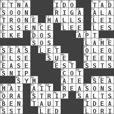 ACROSS 1. Inactive volcano in Sicily 5. Wedding promise 8. Bit 11. Within a short period 12. Port city in Latvia 14. In the manner of 15. Marketplace scale 17. Shopping centers 18. Luau accessory 19. Center 21. Area sheltered from the wind 22. French article 23. Make supply last 24. Two (Sp.) 25. Fitting 27. Mayday 28. Unable to walk 31. Oceans 35. Allow 37. Butter sub 38. Otherwise 39. Take to court 41. Adolescent 42. Relaxation 43. Eastern Standard Time (abbr.) 45. Fast planes 46. Clip 47. Small bed 49. Symbol (abbr.) 51. Had dinner 52. Ocean 55. Floor covering 57. Small island 60. Thinks logically 62. Mouth or opening 63. Remove all contents or possession from 65. Table seasonings 66. Benjamin's nick name 67. Drawn tight 68. The main thing one is thinking about 69. Fast jet (abbr.) 70. Directed 71. Australian parrot (variant) DOWN 1. First name in cosmetics 2. Cod relative 3. Trap for birds or small mammals 4. Queen of England 1702-14 5. Retirement account (abbr.) 6. Deli pickle 7. Stare at amorously 8. Baron Munchausen's specialties 9. Toward shelter 10. Raised platform 13. At sea 16. Conclusions 17. Makes clutter 20. Calm and collected 26. Schemes 29. Confront 30. Immeasurably long periods of time 31. Observes 32. Flair 33. Helper 34. Not well drained, as in land 36. Third day of the wk. 40. Fortification 44. Carry 48. Afternoon social gatherings 50. Vertical spar for supporting sails 52. Twentieth part of a lira 53. Keyboard key 54. Slender Brazilian palm 55. Crowds into 56. Ancient Greek god of war 58. Slanted text style (abbr.) 59. Loyal 61. Travel by water 64. It would