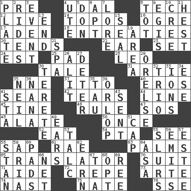 ACROSS 1. Before (prefix) 4. Freehold land 8. Georgia ____ (Atlanta school) 12. Not recorded 14. Traditional theme or motif 16. Legendary monster 17. An important port of Yemen 18. Pleas 20. Watches over 22. Ewer handle 23. Arrange properly for use 24. Eastern Standard Time (abbr.) 25. Groovy apt. 28. Lion 30. Story 31. Nick name for Arthur 35. Compass dir. 37. "Tell ____ the Marines!" 40. Greek god of love 41. Shrivel 42. Separates forcefully 44. Actor's bit 45. Prong on a fork 46. Court order 47. Mayday 48. Having winglike extensions 50. Single time 52. Erode 54. Parent Teacher Association (abbr.) 55. Perceive with the eye 58. Plant excrement 61. Actress Charlotte 63. Insides of hands 65. Interpreter 70. Set of matching outer garments 71. Assistant 72. Streamer paper 73. Johnson of "Laugh-In" 74. Political cartoonist Thomas 75. Nathan's nickname 76. Compass dir. DOWN 1. Food holder 2. Amusement-park features 3. Happening 4. Shoshoni 5. Spanish title 6. Fitting 7. Old wives' tales, e.g. 8. Small child 9. Armor plate that protects the chest 10. Algonquian 11. Command 13. Conclude 15. Lick closed 19. Length times width 21. Health resort 26. Set down 27. Prevent from occurring 29. Threatening words 30. Cylindrical with tapered ends 32. Musical group of three 33. Charged atoms 34. Compass dir. 35. Famous astronaut Armstrong 36. Nanny 38. The 19th letter of the Greek alphabet 39. Lowest deck of a ship 41. R.R. building 43. Posted 49. Hearing organs 51. Head covering 53. Baby powder 55. Disparaging remarks 56. Gives off 57. First name in cosmetics 58. Comedian Laurel of Laurel & Hardy 59. Roberta Peters solo 60. Groovy apts. 62. Merit 64. White ___ sheet 66. Fish or hair follower 67. Afternoon social gathering 68. Choose 69. Portuguese money of account (variant)