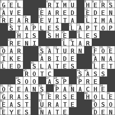 ACROSS 1. Set 4. Tall New Zealand timber tree 8. Possessive pronoun 12. "___ Maria" 13. Having ears or earlike features 14. Locale of original sin 15. Located in or toward the back 17. Webber/Rice musical 18. Pale green bean 19. Paper fasteners 21. Portable computer 23. Part of HMS, perhaps 24. A female animal or person 26. French article 27. Painter Guido (1575-1642) 28. One who doesn't tell the truth 30. Rowing implement 31. Titan orbits this 34. Enemy 37. Mamie's husband 38. Remain 39. Santa ___, CA 40. Directed 41. Chalkboards 42. Allow 43. College mil. group 44. Backtalk 46. "Barney Miller" actor Jack 47. Viper 50. Before (prefix) 51. Seas 54. Flamboyance 57. Pate de foie ____ 58. Laconic 60. Opening into or through something 62. 90 degrees 63. A salt of uric acid 64. Bear (Spanish) 65. Sight organs 66. Nathan's nickname 67. Lair DOWN 1. Slender fish 2. Nights before holidays 3. Resembling or made to resemble leather 4. All-night dance parties 5. From or relating to Ireland 6. Was introduced to 7. Allodial 8. Aide 9. Proofreads 10. San ____ (Riviera town) 11. Fastener 13. Snakelike fish 16. Precipitation 20. 23rd letter of the Greek alphabet 22. Actor Alda or Thicke 25. Dodge 27. Libertine 29. Angers 30. Lubricate 31. Table seasoning 32. Phillipine bananalike plant 33. Teat (slang) 34. It jiggles the polygraph 35. Washington bills 36. Erode 41. Within a short period 43. Cooks with dry heat, as in an oven 44. Health resort 45. Bowlike part 46. Gospel singer Marvin 48. Small fatty European fish 49. Thick mixture 51. Double curve, resembling the letter S 52. Supercomputer manufacturer 53. Astound 55. Born 56. Otherwise 59. Period 61. A really long time