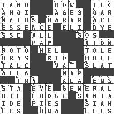 ACROSS 1. Hyperbolic tangent 5. Ribbon knot 8. Affectionate concern, for short 11. Mine, in Marseilles 12. Matures 14. Boat paddle 15. Unmarried girls 17. Ethiopian city, capital of Harari 18. Adept person 19. Center 21. Connecticut Ivy Leaguer 22. Color 23. Compass dir. 24. Everything 25. Distress signal 27. Infant food 28. Tiny particle 31. Printing process, for short 35. Cartoonist voice _ Blanc 37. Lacquered or enameled metalware 38. Mouths or openings 39. To free from 41. Hollow 42. Baby powder 43. Large container 45. Narrow board 46. Silent film actress Nazimova 47. Atlas unit 49. Attempt 51. Chicken ___ king 52. Followers of ems 55. R.R. building 57. First lady 60. Commissioned military rank 62. Lubricate 63. Cabin 65. Before Barbara or Clara 66. Binary compound 67. Sliced desserts 68. Thailand, formerly 69. French article 70. Heredity factor (abbr.) 71. Snakelike fish DOWN 1. Corrects by punishment or discipline 2. Collect or gather 3. Annoying sound 4. Flintstone garb 5. Sound made by sheep 6. Legendary monster 7. Welt 8. Inedible or poisonous agaric 9. Made of lace 10. Algonquian 13. Indian titles of respect 16. Fastener 17. Aide 20. Burrowing marine mollusk 26. Profane or obscene expressions 29. Spanish pot 30. Rendezvous 31. Round or rotation of duties 32. Of the mouth 33. Baron Munchausen's specialties 34. Motion picture award 36. 54 in ancient Rome 40. Break 44. Falsehood 48. Baking dishes 50. Sharp bark 52. Bert's buddy 53. Brizilian seaport 54. Hits or strikes with great force 55. Earth 56. Periodic rise and fall of the sea level 58. Lacking any legal or binding force 59. Genesis locale 61. Relaxation 64. Girls' org. (abbr.)