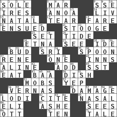 ACROSS 1. Not divided or shared with others 5. Make imperfect 8. Compass dir. 11. Angers 12. Small Philippine buffalo 14. 54 in ancient Rome 15. Brizilian seaport 17. Lacerate 18. Conductor's collection 19. Took place subsequently 21. Moe Howard, for one 23. Arrange properly for use 25. Periodic rise and fall of the sea level 26. Inactive volcano in Sicily 27. Perceive with the eye 28. Binary compound 31. Partially opened flower 33. _ Lanka 35. Soup utensil 37. French philosopher Descartes 38. Single 40. Restaurants 41. Place in a line 43. Increase 45. Fast jet (abbr.) 46. Erode 47. Sound made by sheep 50. Food container 52. Crowds into 53. Slangy assent 54. Actresses Bloom and Felton 56. Break 61. Farming town in central California 62. Quote 65. Rhinal 66. Biblical high priest 67. American tennis player Robert 68. Observes 69. Baseball player Mel 70. Nine, plus one 71. Lie DOWN 1. Trig term 2. NW Algerian seaport 3. Allows 4. He sold his birthright 5. Floor protector 6. A saturated hydrocarbon 7. Exposes to great heat 8. Volcanic refuse 9. Father 10. First lady 13. Nick name for Arthur 16. For fear that 18. Enemy 20. Hiding places for outlaws 22. Lyric poems 24. Pacific island yam 26. Genesis locale 28. Charged atoms 29. Do not 30. Followers of ems 31. Actor Lugosi 32. A single undivided whole 34. _ tizzy (2 wds.) 36. Expression of disdain 37. Actress Charlotte 39. Whirlpool 42. Inky black, to poets 44. Passed on 48. Phillipine bananalike plant 49. Help 51. Connect, as a bridge 52. Medical imaging device (abbr.) 54. Electrical Unit 55. Prepare for publication 57. Vertical spar for supporting sails 58. Toward the sea 59. Highlander 60. Otherwise 61. Lion 63. Definite Article 64. Car or cant ending