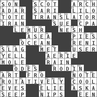 ACROSS 1. Manchild 4. Native of Scotland 8. Bowlike part 12. The sixth month of the Jewish calendar 14. Indian skirt 15. _ and Stitch 16. Lug 17. Interpreter 20. SW Asia republic 21. Institute legal proceedings 22. Numbers guy (abbr.) 23. Arboreal primate 27. Soft 29. At sea 31. Sliced desserts 34. Sea 35. Painter Guido (1575-1642) 36. Volcanic refuse 39. Was introduced to 41. One who uses or employs something 42. Shout 43. Nest on high 46. Undercover agent 47. Water falling in drops from the sky 48. Lyric poems 51. "The Thinker" sculptor 54. Tate display 56. Back 58. Short letter 61. Producing rotation 66. Calm and collected 67. Nights before holidays 68. Writer Wiesel 69. "____ silly question..." 70. Ooze 71. Cuts off 72. Car or cant ending DOWN 1. Suttee (variant) 2. Scent 3. Relating to or accompanying birth 4. Fast jet (abbr.) 5. Auto 6. Mouth or opening 7. Canisters 8. Chicken ___ king 9. Actors Guy, Robert Welles, and Clint 10. Hoof sound 11. Israeli folk dance 13. French philosopher Descartes 18. Player for Phoenix 19. Area sheltered from the wind 24. Big _ 25. Purpose 26. 480, 500 or 516 sheets of paper 28. Upset 30. Approach 32. Compass dir. 33. Title for a knight 34. Stared 36. Symbol (abbr.) 37. Lion 38. One to whom something is allotted 40. Rend 44. _ de Janeiro 45. Working for oneself (abbr.) 49. Lizard (obsolete) 50. Indian title of respect (Mr.) 52. South American Indian 53. Trap for birds or small mammals 54. Ancient Greek god of war 55. Be footloose 57. Baking chamber 59. Casino tip 60. Liveliness 62. Cleo's killer 63. Biblical high priest 64. Mouth edge 65. Consenting reply
