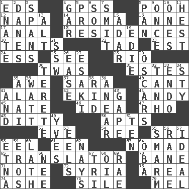 ACROSS 1. Begley and Asner 4. Global Positioning Systems (abbr.) 8. "Silly old bear" 12. California wine valley 14. Scent 16. Queen of England 1702-14 17. Of or related to the anus 18. Homes 20. Portable shelters 22. Small amount or degree 23. Eastern Standard Time (abbr.) 24. Double-curved letter 25. Observe 28. _ de Janeiro 30. It was, poetically 31. _____ Park, CO 35. Deep reverence 37. "Two Mules for Sister ____" 40. Patter 41. Having or resembling wings 42. Supplementing with great effort 44. Actor Griffith 45. Nathan's nickname 46. The content of cognition 47. 17th letter of the Greek alphabet 48. Simple song 50. Flats, for short 52. First lady 54. To separate or throw off 55. _ Lanka 58. Snakelike fish 61. Car or cant ending 63. Wanderer 65. Interpreter 70. Object of repulsion 71. Musical sound 72. Damascus' land 73. Length times width 74. American tennis player Robert 75. Filth; sediment 76. Cartoonist voice _ Blanc DOWN 1. Maternal 2. Natives or inhabitants of Denmark 3. Connects, as a bridge 4. Slender fish 5. Before (prefix) 6. Distress signal 7. Stricken, poetically 8. Baking dish 9. Single time 10. Singles 11. Behest 13. Keyboard modifier key 15. The sixth month of the Jewish calendar 19. Singer Brickell 21. Compass dir. 26. Comfort 27. 1973 Nobel Price Winner (Physics) Leo 29. Motion picture awards 30. Cylindrical with tapered ends 32. Hyperbolic tangent 33. Inside; within (prefix) 34. Filthy place 35. Jai ____ 36. Electrical Unit 38. To free from 39. Approach 41. Also 43. Yawn 49. Jacques Cousteau's middle name 51. Nine, plus one 53. Snakelike fish 55. Excessive but superficial compliments 56. The wife of a rajah (variant) 57. Perfect 58. Inactive volcano in Sicily 59. Greek god of love 60. Thin strip of wood or metal 62. Negative votes 64. Chief or king in Benin or Nigeria 66. Born 67. Three (prefix) 68. Lubricate 69. Actress Charlotte