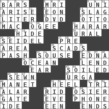 ACROSS 1. Soap units 5. Medical imaging device (abbr.) 8. Single; one (prefix) 11. Originate 13. Period of immesurable duration 14. Volcanic refuse 15. 61 cubic inches 16. Movie disc 17. Von Bismarck 18. Big _ 19. Double curve, resembling the letter S 21. Ethiopian city, capital of Harari 22. Flintstone garb 24. Mountain range 25. Beer mug 27. Before (prefix) 29. Type of rug 30. Heaps 32. Romantic infatuation 33. Lush 35. Pulitzer Prize-winning author Ferber 39. Sea 41. Grant temporary use of 42. Hearing organ 43. Dirtied 45. Stitched 48. Capital and largest city of Mongolia 49. French painter Edouard 50. Person who is morally reprehensible 52. Three (prefix) 55. Having or resembling wings 56. To free from 57. Flexible twig of a willow tree 59. Yard entry 60. First lady 61. Give a jingle 62. Binary compound 63. Car or cant ending 64. Conclusions DOWN 1. Lip ointment 2. Roberta Peters solo 3. Actors Guy, Robert Welles, and Clint 4. Compass dir. 5. Ancient Persian 6. Be footloose 7. Indiana (abbr.) 8. Extremist 9. Brizilian seaport 10. Russian composer Stravinsky 12. Wear away 14. Fly high 20. Set 21. Took on color 23. Potato state 25. Plant excrement 26. Epoch 27. Personal Computers (abbr.) 28. Actress Charlotte 30. Player for Phoenix 31. Former Milwaukee Brewers owner Bud 33. Ocean 34. Rowing implement 36. Conveyance 37. Compass dir. 38. Find the sum of 40. Penny 43. Take to court 44. Fourth or lowest deck 45. First course 46. Maternal 47. Past tense of be (plural) 49. Wise men 50. Hub of activity 51. Genesis locale 53. Tear apart 54. Angers 56. To separate or throw off 58. A female animal or person