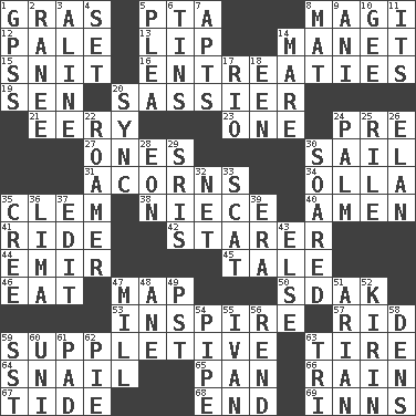 ACROSS 1. Pate de foie ____ 5. Parent Teacher Association (abbr.) 8. Wise men 12. Light colored 13. Mouth edge 14. French painter Edouard 15. In a ____ (agitated or irritated) 16. Pleas 19. Elected rep. 20. More impudent 21. Suggestive of the supernatural 23. Single 24. Before (prefix) 27. Singles 30. Move on water 31. Oak nuts 34. Spanish pot 35. Clement's nick name 38. Sibling's daughter 40. So be it 41. Travel on an animal 42. A viewer who gazes fixedly 44. Independent ruler or chieftain 45. Lie 46. Ingest 47. Atlas unit 50. Neighbor of Neb. 53. Heighten or intensify 57. To free from 59. Supplying deficiencies 63. Hoop that covers a wheel 64. Slow-paced one 65. Baking dish 66. Water falling in drops from the sky 67. Event that recurs at intervals 68. Conclusion 69. Taverns DOWN 1. Global Positioning Systems (abbr.) 2. Indian princess (variant) 3. Place in a line 4. Arrange properly for use 5. Entreaty 6. Canisters 7. Tenement units (abbr.) 8. Floor protector 9. Black tropical American cuckoo 10. Turn to the right 11. It is 14. Female horse 17. River (Sp.) 18. Car or cant ending 20. Synchronize (abbr.) 22. Wanderer 24. Inside of hand 25. Cause heat under the collar 26. Enthusiasm 28. Period of immesurable duration 29. Indian titles of respect 30. Flew 32. Fish or hair follower 33. Leave at once 35. Algonquian 36. Pale green bean 37. Prepare for publication 39. Period 43. Otherwise 47. Place where flour is made 48. One (Scot) 49. Pacific Standard Time (abbr.) 51. Believer in; advocate of (suffix) 52. Japanese brewing company 54. Corncob 55. "Terrible" tsar 56. Tear apart 58. Lairs 59. Fast jet (abbr.) 60. University (slang) 61. Writing tablet 62. Sliced dessert 63. Three (prefix)