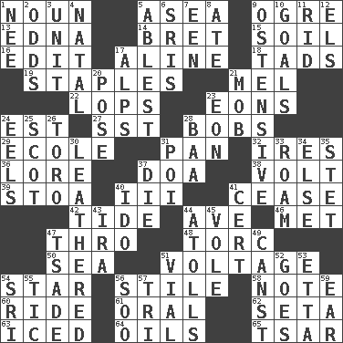 ACROSS 1. Part of speech 5. At sea 9. Legendary monster 13. Pulitzer Prize-winning author Ferber 14. Cy Young winner Saberhagen 15. Land 16. Prepare for publication 17. Place in a line 18. Small amounts or degrees 19. Paper fasteners 21. Cartoonist voice _ Blanc 22. Chops off 23. Immeasurably long periods of time 24. Eastern Standard Time (abbr.) 27. Fast jet (abbr.) 28. Moves up and down 29. Learning spot: Fr. 31. Baking dish 32. Angers 36. Old wives' tales, e.g. 37. ___ good deed 38. Electrical Unit 39. Portico 40. One more than two 41. Desist 42. Event that recurs at intervals 44. "___ Maria" 46. Was introduced to 47. Through, poetically 48. Torque (variant) 50. Ocean 51. Electrical Measurement 54. Play the lead 56. Vertical member of a panel or frame 58. Short letter 60. Travel on an animal 61. Relating to the mouth 62. Stalk of a moss capsule 63. On the rocks 64. Lubricates 65. Russian ruler of old DOWN 1. Born 2. Probability 3. A single undivided whole 4. Brizilian seaport 5. Most capable 6. Indian titles of respect 7. Car or cant ending 8. Had dinner 9. Clearly or manifestly demonstrative 10. Scores awarded for successful feats 11. To free from 12. Raised railways 17. High mountains 20. Introduce or present, as a question 21. Disorderly crowd 23. A really long time 24. Snakelike fish 25. Highlander 26. "Corrida" creature 28. Sound made by sheep 30. Tough but pliablecoriaceous 31. Luau course 33. Wander 34. Otherwise 35. Proofreading order 37. Pass on 40. Wedding promise 41. Certainty 43. Retirement account (abbr.) 44. Ringlike coral islands and reefs 45. Grand slam 47. Sadhe (variant) 49. 2nd pers. sing. pres. of can (arch.) 51. Small bottle 52. Travels 53. Singer James 54. _ Lanka 55. Nervous spasm 56. "Barney Miller" actor Jack 57. Three (prefix) 59. Hearing organ