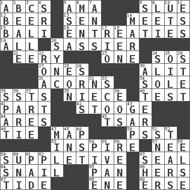 ACROSS 1. Lettered men learn these first 5. Nursemaid (var.) 8. Change direction abruptly 12. Fermented drink made from hops 13. Elected rep. 14. Confronts 15. Indonesian resort city 16. Pleas 19. Everything 20. More impudent 21. Suggestive of the supernatural 23. Single 24. Distress signal 27. Singles 30. Set down 31. Oak nuts 34. Flatfish 35. Fast planes 38. Sibling's daughter 40. Trial 41. Piece 42. Moe Howard, for one 44. Ancient Greek god of war 45. Russian ruler of old 46. Make a knot 47. Atlas unit 50. Inconspicuous attention getter 53. Heighten or intensify 57. Born 59. Supplying deficiencies 63. Lick closed 64. Slow-paced one 65. Baking dish 66. Possessive pronoun 67. Event that recurs at intervals 68. Compass dir. 69. Celtic language DOWN 1. Swedish rock group 2. Calif. Air Force Base 3. Cell (Danish) 4. Indian title of respect (Mr.) 5. Toward the sea 6. Not women's 7. Pismires 8. Put into a specified state 9. Flowery wreath 10. Shoshoni 11. Double-curved letter 14. Female horse 17. River (Sp.) 18. Car or cant ending 20. Synchronize (abbr.) 22. Ridicules or criticizes harshly 24. _ gin 25. Petroleums 26. Proofreading order 28. Period of immesurable duration 29. Indian titles of respect 30. Michaelmas daisies 32. Remaining after all deductions 33. Native of Scotland 35. Petty quarrel 36. Indian skirt 37. Woody plant 39. Greek goddess of the dawn 43. Yawn 47. Place where flour is made 48. One (Scot) 49. Pacific Standard Time (abbr.) 51. Contemptuous expression 52. Pulls into pieces 54. Corncob 55. "Terrible" tsar 56. French philosopher Descartes 58. Otherwise 59. Fast jet (abbr.) 60. Corn or form start 61. Writing tablet 62. Sliced dessert 63. A female animal or person