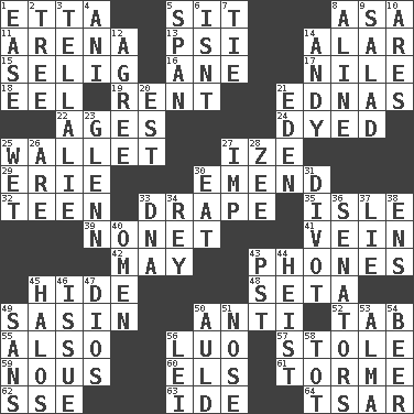ACROSS 1. Singer James 5. Be seated 8. White ___ sheet 11. Sports stadium 13. Air pressure measure (abbr.) 14. Having or resembling wings 15. Former Milwaukee Brewers owner Bud 16. A saturated hydrocarbon 17. The longest river in the world 18. Snakelike fish 19. Monthly bill 21. Ferber et al. 22. Ripens 24. Colored 25. Place for singles 27. Ending with capital 29. 4th largest of the Great Lakes 30. Make improvements or corrections to 32. Adolescent 33. Window treatment 35. Capri or Wight 39. Music written for nine 41. Distinctive style or manner 42. Fifth month 43. Gives a jingle 45. Flintstone garb 48. Bristle 49. Indian antelope 50. Against 52. Keyboard key 55. In addition 56. Nilotic language 57. Fur scarf 59. Good sense 60. Raised railways 61. Singer Mel 62. Compass dir. 63. Binary compound 64. Russian ruler of old DOWN 1. Relaxation 2. Woody plant 3. Copy Pinocchio 4. Black tropical American cuckoo 5. Connect, as a bridge 6. Is not 7. Neckwear 8. Place in a line 9. First course 10. Ancient Greek god of war 12. Match 14. Actor Griffith 20. Eastern Standard Time (abbr.) 21. Paradise 23. American astronaut and politician John 25. Soggy 26. "We ___ not amused" (Victoria) 27. Naughty child 28. Last letter of the English alphabet 30. Consume 31. A piece of turf (Scot.) 33. Heredity factor (abbr.) 34. Marina Del _, California 36. Legislators 37. Falsehood 38. Followers of ems 40. Presage 43. Pacific Standard Time (abbr.) 44. Robbery 45. Radiant circles of light 46. Come out of 47. "Vaya con ____" 49. Without 50. Old (Scot.) 51. Characteristic smell of wine 53. _ mater 54. Fermented drink made from hops 56. Flowery wreath 58. Small child