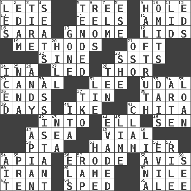ACROSS 1. Allows 5. Relationship diagram 9. Opening into or through something 13. Singer Brickell 14. Snakelike fish 15. Among 16. "Two Mules for Sister ____" 17. Dwarf 18. Flaplike coverings 19. Modes 21. Often (poetically) 22. Trig term 23. Fast planes 24. _ tizzy (2 wds.) 27. Directed 28. Son of Odin 29. Lessep's creation 31. Area sheltered from the wind 32. Freehold land 36. Conclusions 37. Shallow baking pan 38. Edible starchy tuberous root 39. 24-hour periods 40. D.D.E's nickname 41. Riviera of "Kiss of the Spider Woman" 42. To the inside or interior of 44. Pipe bend 46. Elected rep. 47. At sea 48. Small bottle 50. Parent Teacher Association (abbr.) 51. More given to overacting 54. Capital of Western Samoa 56. Eat (away) 58. Opinion 60. SW Asia republic 61. Unable to walk 62. Mediterranean tributary 63. Portable shelter 64. Moved rapidly 65. Toward shelter DOWN 1. French article 2. Dutch treat 3. Hoop that covers a wheel 4. Theater features 5. Looked after 6. Vintage cars 7. Shade tree 8. Compass dir. 9. Not exactly gospel 10. Leaves out 11. Hat (slang) 12. Begley and Asner 17. Went 20. Land elevation 21. Bear (Spanish) 23. A female animal or person 24. On the rocks 25. Grandmother 26. "60 Minutes" Commentator Rooney 28. Nine, plus one 30. Aide 31. Falsehood 33. Raised platform 34. Johnson of "Laugh-In" 35. Grant temporary use of 37. Ring climax 40. Call ___ day 41. Burrowing marine mollusk 43. Teachers' org. 44. Dodged 45. Citrus frut 47. Bee-related 49. Woody, climbing, usually tropical plant 51. Residence 52. Tending to cause great harm 53. Cause heat under the collar 54. Small island 55. Before (prefix) 56. Raised railways 57. Strike 59. Perceive with the eye