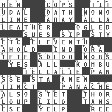ACROSS 1. Layer 4. 911 reaches them 8. Teat (slang) 11. Allodial 13. Pledge 14. Words to Nanette 15. Actor's bit 16. Like ___ of sunshine 17. Silent film actress Nazimova 18. Cordwainer's material 21. Stared at amorously 22. Institutes legal proceedings 23. Small drink 25. Filthy place 26. And so on (abbr.) 29. Veterans Day date 32. Hold, grip (Informal) 34. Working for oneself (abbr.) 35. Mouth or opening 38. False hair 39. Twentieth part of a lira 41. Disorderly crowds 43. Consenting reply 44. Everything 45. Dried seaweed eaten as food 46. Copy Pinocchio 50. Baking dish 51. Compass dir. 54. R.R. building 55. Afresh 57. Tinged 59. Flamboyance 63. In addition 64. Proofreading order 67. Son of Odin 68. Central Nebraska county 69. _ and Stitch 70. Scottish caps 71. Compass dir. 72. Sharp bark 73. To separate or throw off DOWN 1. Frame or body of a ship 2. Singer Brickell 3. Grandmother 4. Rough 5. Boat paddle 6. Parent Teacher Association (abbr.) 7. Like a shrinking violet 8. For Whom the Bell _____ 9. An arm off of a larger body of water 10. Sycophant 12. Allows 14. Tired old horse 19. Became colored 20. Snakelike fish 21. Elect 23. Post 24. _ china 26. Ingest 27. Those people 28. ____ d'Azur (French Riviera) 30. Country estate 31. Like (prefix) 33. For fear that 36. Play 37. Swedish rock group 39. Table seasoning 40. Rounded earthenware pot or jar 42. Player for Phoenix 45. Peachy ____! 47. Eastern Standard Time (abbr.) 48. Portable computer 49. _ tizzy (2 wds.) 51. Having lost freshness 52. Grain storage towers 53. Follow as a consequence or result 56. Electrical Unit 58. Police officer (slang) 60. Burn to charcoal 61. Dwelling 62. Celtic language 64. Cunning 65. Make a knot 66. Pipe bend