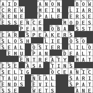 ACROSS 1. Assist 4. Soon (poet.) 8. Ribbon knot 11. Group working together 13. Chow _ 14. One who doesn't tell the truth 15. French philosopher Descartes 16. Light colored 17. Celtic language 18. Center 21. Methods 22. Lightbulb-shaped fruit 23. Chief or king in Benin or Nigeria 25. Fast jet (abbr.) 26. Ewer handle 29. Orators 32. Make a splashing sound 34. Untruth 35. Bear (Spanish) 38. Lick closed 39. Flexible twig of a willow tree 41. _ and Stitch 43. Australian flightless bird 44. Baking dish 45. Started a card game 46. Plea 50. Floor covering 51. Compass dir. 54. White ___ sheet 55. Canisters 57. Major League Baseball Commissioner Bud 59. Pertaining to the sea 63. Drawn tight 64. Anneal 67. Indian skirt 68. Extremities 69. Tending to cause great harm 70. Petty quarrel 71. Compass dir. 72. Moistens 73. One (Scot) DOWN 1. Measure of real estate 2. Angers 3. Cub Scout units 4. Electrical Unit 5. Teachers' org. 6. Petroleum 7. Compass dir. 8. Avian creatures 9. Fertile tracts in a desert 10. Take or capture by force 12. Shed a tear 14. Lion 19. Soft 20. Head covering 21. Make imperfect 23. Migrant worker of the '30s 24. Fermented drink made from hops 26. Double-curved letter 27. Toward shelter 28. Wander 30. Place in a line 31. Not divided or shared with others 33. Change direction abruptly 36. Thailand, formerly 37. Rounded earthenware pot or jar 39. Elects 40. "Two Mules for Sister ____" 42. Baseball player Mel 45. Centimeter-gram-second unit of force 47. Tired old horse 48. Ringlike coral islands and reefs 49. Nervous spasm 51. _____ Park, CO 52. Seines 53. Evade 56. Backtalk 58. ___ a Wonderful Life 60. California wine valley 61. SW Asia republic 62. Quote 64. ___ Haven, CT 65. First lady 66. Small island