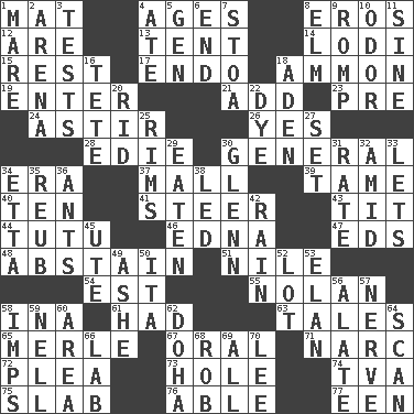 ACROSS 1. Floor protector 4. Ripens 8. Greek god of love 12. "We ___ not amused" (Victoria) 13. Portable shelter 14. Farming town in central California 15. Relief 17. Inside; within (prefix) 18. ID or VA city 19. Keyboard key 21. Find the sum of 23. Before (prefix) 24. Moving about 26. It is so 28. Singer Brickell 30. Commissioned military rank 34. Period 37. Promenade 39. Docile 40. "___ Little Indians" 41. Bull 43. Teat (slang) 44. Ballerina skirt 46. Pulitzer Prize-winning author Ferber 47. Begley and Asner 48. Refrain by choice 51. "Death on the ____" 54. Eastern Standard Time (abbr.) 55. Pitcher Ryan 58. _ tizzy (2 wds.) 61. Possessed 63. Falsehoods 65. Haggard of country music 67. Taken by mouth 71. Drug cop 72. Entreaty 73. Hollow 74. Federal power corp. 75. Thick slice 76. Competent 77. Car or cant ending DOWN 1. Female horse 2. Sports stadium 3. Trials 4. Had dinner 5. Commissioned military rank (abbr.) 6. Conclude 7. Portico 8. Shade tree 9. Play 10. Scent 11. Trig term 16. False hair 18. Arabian gulf 20. To free from 22. Color 25. Basketball hoops 27. Arrange properly for use 29. Ingested 30. American astronaut and politician John 31. Assign a rank or rating to 32. Among 33. Allows 34. Singer James 35. Reuben's nickname 36. Pismires 38. Directed 42. Water falling in drops from the sky 45. Shoshoni 49. American tennis player Robert 50. Call ___ day 52. Car dealer's back yard 53. Enthusiasm 56. Having winglike extensions 57. Boldness 58. Naughty children 59. 1994 drama film starring Jodie Foster 60. Length times width 62. Capital of the state of Qatar 64. Examine minutely or intensely 66. Experiment locale 68. Director Reiner 69. Everything 70. Area sheltered from the wind