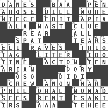 ACROSS 1. Natives or inhabitants of Denmark 6. Sound made by sheep 9. Writing instrument 12. Came up 13. Deli pickle 14. Had on 15. Sibling's daughter 16. Prepare for publication 17. Capital of Western Samoa 18. In the manner of 19. Political cartoonist Thomas 20. A slight indication 21. Located in or toward the back 23. Everything 24. Petty quarrel 25. Pulls into pieces 28. Biblical high priest 30. All-night dance parties 34. Musical group of three 35. Label 36. 61 cubic inches 38. Wedding promise 39. Prong on a fork 41. Gambison 43. Nine, plus one 44. Believer in; advocate of (suffix) 46. Rowboat 48. Bear (Spanish) 49. "You Light Up My Life" star Conn 50. Ship's personnel 51. Soon (poet.) 53. Make imperfect 56. Silvers or Donahue 57. Spoken 58. Roamer 60. Observes 61. Monthly bill 62. 1973 Nobel Price Winner (Physics) Leo 63. Big collection agency 64. American Automobile Association (abbr.) 65. Giggle DOWN 1. One of the 12 tribes of Israel 2. Roberta Peters solo 3. Christmas carol 4. Fortification 5. Observe 6. Auction offers 7. Set down 8. Keyboard modifier key 9. Teen's desire 10. 4th largest of the Great Lakes 11. Teachers' org. 13. Letter starter 14. Place for singles 19. Relating to or accompanying birth 20. Feline 22. Ewer handle 24. Seigniories (variant) 26. Travel on an animal 27. Within a short period 28. Singer James 29. Den 31. By way of 32. And so on (abbr.) 33. Put into a specified state 37. "The Thinker" sculptor 40. Artist's stands 42. Lower and raise head in agreement 45. At this time 47. Full of chinks, cracks, or crevices 49. Stupid person 50. "Mermaids" star 51. Type of rug 52. Nanny 54. Wet nurse 55. Immoral or dissolute person 56. 23rd letter of the Greek alphabet 57. Mouth or opening 58. Remaining after all deductions 59. Expire
