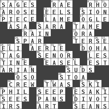 ACROSS 1. Gurus 6. Actress Charlotte 9. 17th letter of the Greek alphabet 12. Came up 13. Snakelike fish 14. The Jewish people; Israel 15. Part 16. Unable to walk 17. Stare 18. White ___ sheet 19. "Two Mules for Sister ____" 20. Not wild 21. Water falling in drops from the sky 23. Mouth or opening 24. Practice fight 25. Laconic 28. Biblical high priest 30. Nest on high 34. Capital of the state of Qatar 35. Label 36. Sir (Sp.) 38. French article 39. Prong on a fork 41. Artist's stand 43. Eastern Standard Time (abbr.) 44. Believer in; advocate of (suffix) 46. Beer foam 48. Bear (Spanish) 49. Portico 50. Ship's personnel 51. It was, poetically 53. What Jean-Claude Killy likes to do 56. Silvers or Donahue 57. Ooze 58. 1973 Nobel Price Winner (Physics) Leo 60. Perceives with the eye 61. Baking dishes 62. A piece of turf (Scot.) 63. Big collection agency 64. Nonscientific branch of learning 65. Seines DOWN 1. Plant excrement 2. Operatic vocal solo 3. Travels 4. Fortification 5. Observe 6. Hitchcock's "____ Window" 7. _ mater 8. Compass dir. 9. Complicated, petty procedures 10. Opening into or through something 11. Single 13. Style 14. Flew 19. Male parents of animals 20. Small child 22. Auto club (abbr.) 24. Seigniories (variant) 26. "______ My Girl" (Turtles hit) 27. Compass direction 28. Singer James 29. Den 31. Portuguese money of account (variant) 32. _ tizzy (2 wds.) 33. Greek goddess of the dawn 37. Musical pauses 40. Artist's stands 42. Nilotic language 45. At this time 47. Small ungulate mammals of Africa 49. Plant excrements 50. "Mermaids" star 51. Lacerate 52. Left 54. Polynesian shrub of the pepper family 55. Image 56. 23rd letter of the Greek alphabet 57. Health resort 58. Begley and Asner 59. It is