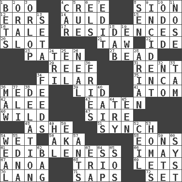 ACROSS 1. Surprise greeting 4. Algonquian 8. The Jewish people; Israel 12. Blunders 14. Old (Scot.) 15. Inside; within (prefix) 16. Story 17. Dwellings 20. Position in a hierarchy or organization 21. The 23rd letter of the Hebrew alphabet 22. Binary compound 23. Eucharist need 27. Necklace unit 29. Coral collection 31. Monthly bill 34. Of or pertaining to a thread or threads 35. South American Indian 36. Ancient Persian 39. Hat (slang) 41. Smallest unit of an element 42. Toward shelter 43. Eroded 46. Rampant 47. The founder of a family 48. American tennis player Robert 51. Synchronize (abbr.) 54. Soggy 56. Alias (abbr.) 58. Immeasurably long periods of time 61. The property of being fit to eat 66. "If ____ say so..." 67. Small Philippine buffalo 68. Musical group of three 69. Allows 70. Austrian-born American filmmaker Fritz 71. Plant excrements 72. Arrange properly for use DOWN 1. Stakes 2. Taken by mouth 3. Fourth or lowest deck 4. 4-wheeled motor vehicle 5. Sorrow 6. Raised railways 7. Prepare for publication 8. Elected rep. 9. Happening 10. Wrote a lyric poem 11. Olfactory organ 13. Bristle 18. Apply (a substance) by light strokes 19. She-sheep 24. Three (prefix) 25. Snakelike fish 26. Actress Patricia 28. Believer in; advocate of (suffix) 30. Strips of potato fried in deep fat 32. Non-commissioned officer (abbr.) 33. Scottish cap 34. Gives food to 36. Informal term for the mouth 37. Biblical high priest 38. Conveyance 40. Raised platform 44. Attempt to accomplish something 45. Car or cant ending 49. Actor Linden 50. Supplement with great effort 52. To provide with a ceiling 53. Residences 54. Welt 55. Pulitzer Prize-winning author Ferber 57. Pismires 59. Nathan's nickname 60. System (abbr.) 62. Paper or plastic container 63. Period 64. Small drink 65. Mayday