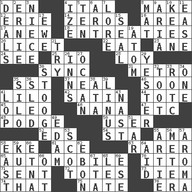 ACROSS 1. Lair 4. Slanted text style (abbr.) 8. Create 12. One of the Great Lakes 14. Nothings 16. Length times width 17. Afresh 18. Pleas 20. It is permitted: Lat. 22. Erode 23. One (Scot) 24. Observe 25. River (Sp.) 28. Myrna of the movies 30. Synchronize (abbr.) 31. Paris' subway 35. Fast jet (abbr.) 37. Be tempered by heat 40. Within a short period 41. _ and Stitch 42. Smooth fabric 44. Lug 45. Margarine 46. Grandmother 47. And so on (abbr.) 48. Porridge 50. One who uses or employs something 52. Begley and Asner 54. R.R. building 55. Nursemaid (var.) 58. Supplement with great effort 61. Adept person 63. Less widely known 65. Form of transportation 70. "Tell ____ the Marines!" 71. Posted 72. Hauls 73. South Vietnam president (1954) 74. Not this but _ 75. Nathan's nickname 76. Period DOWN 1. Allots cards 2. Bert's buddy 3. Sibling's daughter 4. Ending with capital 5. Nine, plus one 6. Tate display 7. Old wives' tales, e.g. 8. Floor protector 9. Roberta Peters solo 10. Peachy ____! 11. Comfort 13. She-sheep 15. Lick closed 19. Smallest unit of an element 21. Attempt 26. Lodging establishments 27. Sea 29. Last past 30. Moe Howard, for one 32. A blast of a horn 33. College mil. group 34. Single 35. Grain storage tower 36. Downhill vehicle 38. "One Day ___ Time" 39. "_ and Lucy" (Charlie Brown theme song) 41. Chop off 43. Political cartoonist Thomas 49. Dutch treat 51. Ewer handle 53. Native of Scotland 55. Nick name for Arthur 56. Distance measurement 57. Odor 58. Compass direction 59. Malaysian steamed pastry 60. Inactive volcano in Sicily 62. Inky black, to poets 64. Assist 66. Baseball player Mel 67. Call ___ day 68. Allow 69. Compass dir.