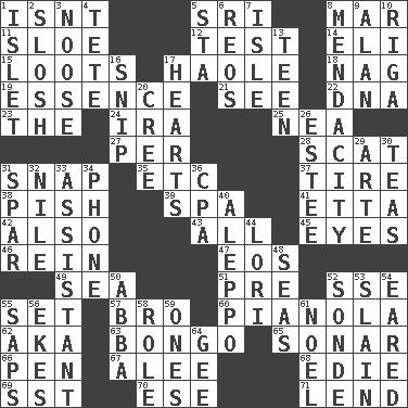 ACROSS 1. Is not 5. _ Lanka 8. Impair 11. _ gin 12. Trial 14. Connecticut Ivy Leaguer 15. Plunders 17. White Person, in Hawaii 18. Tired old horse 19. Center 21. Observe 22. Heredity factor (abbr.) 23. Definite Article 24. Lyricist Gershwin 25. Teachers' org. 27. For each 28. Leave at once 31. Fastener 35. And so on (abbr.) 37. Become fatigued 38. Expression of disdain 39. Health resort 41. Singer James 42. In addition 43. 100% 45. Snake ____ (dice throw) 46. It's straight from the horse's mouth 47. Greek goddess of the dawn 49. Ocean 51. Before (prefix) 52. Compass dir. 55. Put into a specified state 57. Sis' sibling 60. Player piano 62. Alias (abbr.) 63. Beat drum 65. Echolocation 66. Writing instrument 67. Toward shelter 68. Singer Brickell 69. Fast jet (abbr.) 70. Compass dir. 71. Grant temporary use of DOWN 1. Small island 2. Agitate, as a liquid 3. Trap for birds or small mammals 4. False hair 5. R.R. building 6. Vintage cars 7. Small island 8. Ananias' fault 9. Actor Alda or Thicke 10. Port city in Latvia 13. Adolescent 16. Sever or remove by pinching or nipping 17. Centers 20. Algonquian 26. First name in cosmetics 29. Johnson of "Laugh-In" 30. Afternoon social gatherings 31. Practice fight 32. "Death on the ____" 33. Helper 34. Give a jingle 36. Numbers guy (abbr.) 40. City in Syria 44. Australian parrot (variant) 48. Oceans 50. Swedish rock group 52. Message 53. Killed 54. Having ears or earlike features 55. Plant excrements 56. Supplements with great effort 58. Hero or heavy, e.g. 59. Washington bills 61. Christmas carol 64. Turn to the right