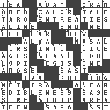 ACROSS 1. Beverage made from leaves 4. First man 8. Northwest Algerian city 12. Wrote a lyric poem 14. Bodily heat indicating an inflammation 16. Falsehood 17. Pacific island yam 18. Pleas 20. Place in a line 22. Conclude 23. Remaining after all deductions 24. Area sheltered from the wind 25. Ewer handle 28. Morning condensation 30. Inventor's middle name 31. Relating to the nose 35. Big collection agency 37. To the inside or interior of 40. Louse (plural) 41. Eons 42. Gospel singer Marvin 44. Australian parrot (variant) 45. Farming town in central California 46. The front part of a cuirass 47. Compass dir. 48. Came up 50. 90 degrees 52. Federal power corp. 54. Sorrow 55. Coat; cloak 58. Dripping 61. Lyricist Gershwin 63. Approach 65. The property of being fit to eat 70. Comfort 71. Father 72. Empty completely 73. Length times width 74. Adolescent 75. "Two Mules for Sister ____" 76. Fast jet (abbr.) DOWN 1. "_____ Recall" 2. Peak District village in England 3. Nest on high 4. Adept person 5. Daniel's nick name 6. Keyboard modifier key 7. Greater amount 8. Baseball player Mel 9. Precipitation 10. Toward shelter 11. Egg locale 13. Spanish title 15. Tear apart 19. An important port of Yemen 21. Snakelike fish 26. Deliberation 27. The wife of a rajah (variant) 29. Place for singles 30. Help 32. The Jewish people; Israel 33. 43,560 square feet 34. Luau accessory 35. Russian composer Stravinsky 36. Redecorate 38. Label 39. Flexible twig of a willow tree 41. Chicken ___ king 43. Son of Isaac 49. Morally bad or wrong 51. Ocean 53. Ancient Greek god of war 55. Pulls into pieces 56. Fertile tracts in a desert 57. Relatively large 58. Compass direction 59. Singer Brickell 60. Hoop that covers a wheel 62. Pismires 64. Teachers' org. 66. Benjamin's nick name 67. Period 68. Title for a knight 69. Health resort