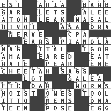 ACROSS 1. Eastern Standard Time (abbr.) 4. Operatic vocal solo 8. Sharp remark 12. Slender fish 13. Allows 14. Toward shelter 15. Smallest unit of an element 17. Path through which fluid escapes 18. Relating to the nose 19. A piece of turf (Scot.) 21. White ___ sheet 23. Mouth or opening 24. Effrontery 26. Accounting whiz (abbr.) 28. Hearing organs 30. Player piano 34. Tired old horse 37. Slanted text style (abbr.) 39. Russian composer Stravinsky 40. Nursemaid (var.) 41. Having ears or earlike features 43. Consume 44. Pace 46. Lightbulb-shaped fruit 47. Compass dir. 48. Leopard's kin 51. Droops 54. Car dealer's back yard 55. An organ shaped like a helmet 58. And so on (abbr.) 61. Rowing implement 63. Typical models 65. Damp 67. Washington bills 71. Instrument 72. "Tell ____ the Marines!" 73. Not women's 74. Heredity factor (abbr.) 75. Adolescent 76. Introduce or present, as a question 77. Ovum DOWN 1. Mild oath 2. Smooth fabric 3. Collection of objects 4. 100% 5. To sift 6. Call ___ day 7. "____ silly question..." 8. Sound made by sheep 9. In addition 10. Located in or toward the back 11. Actor Lugosi 16. Greater amount 18. California wine valley 20. Federal power corp. 22. _-fi 25. 4th largest of the Great Lakes 27. Black tropical American cuckoo 29. Staphylococcus 30. Entreaties 31. Double curve, resembling the letter S 32. Grant temporary use of 33. Johnson of "Laugh-In" 34. Drug cop 35. Wet nurse 36. Yard entry 38. "We ___ not amused" (Victoria) 42. To trail on the ground 45. Snakelike fish 49. A blast of a horn 50. _ moment's notice (2 wds.) 52. Separate the seeds from cotton 53. Groove 56. Eat (away) 57. Amid 58. Send forth 59. Haul 60. Quote 62. Frolic 64. Volcanic refuse 66. Male offspring 68. Modern: prefix 69. Followers of ems 70. Compass dir.