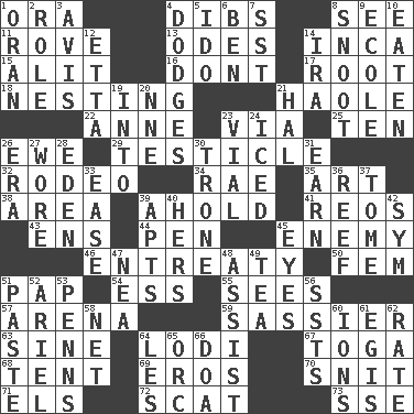 ACROSS 1. Mouth or opening 4. Claim 8. Perceive with the eye 11. Be footloose 13. Lyric poems 14. South American Indian 15. Set down 16. Do not 17. Carrot, for example 18. Nestling 21. White Person, in Hawaii 22. Queen of England 1702-14 23. By way of 25. Nine, plus one 26. She-sheep 29. One of the two male reproductive glands 32. Cowboy competition 34. Actress Charlotte 35. Tate display 38. Type of rug 39. Hold, grip (Informal) 41. Vintage cars 43. Followers of ems 44. Fenced enclosure 45. Foe 46. Plea 50. Opposite of masc. 51. Infant food 54. Double-curved letter 55. Observes 57. Sports stadium 59. More lively and spirited 63. Trig term 64. Farming town in central California 67. Ancient Roman robe 68. Portable shelter 69. Greek god of love 70. In a ____ (agitated or irritated) 71. Raised railways 72. Scram! 73. Compass dir. DOWN 1. NW Algerian seaport 2. Hero or heavy, e.g. 3. Opinion 4. Evades 5. Wedding promise 6. Benjamin's nick name 7. Fast jet (abbr.) 8. Snob 9. Learning spot: Fr. 10. Eroded 12. Singer James 14. Lyricist Gershwin 19. To the inside or interior of 20. Compass dir. 21. Actor Linden 23. Small bottle 24. On the rocks 26. Period 27. Had on 28. Paradise 30. Marketplace scale 31. Merit 33. Relaxation 36. Coral collection 37. Heavy book 39. Tenement units (abbr.) 40. Possessive pronoun 42. Symbol (abbr.) 45. Snake ____ (dice throw) 47. Teachers' org. 48. Aid 49. Afternoon social gathering 51. Thick mixture 52. Satellite of Uranus 53. Actor Sean's family 56. Fast planes 58. Remaining after all deductions 60. Charged particles 61. Armor plate that protects the chest 62. Pace 64. French article 65. The grampus (Milton) 66. ___ good deed