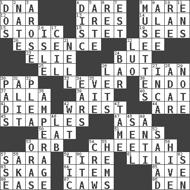 ACROSS 1. Heredity factor (abbr.) 4. Have the gumption 8. Female horse 12. Boat paddle 13. Angers 14. ____ Bator, Mongolia 15. Unemotional 18. Proofreading order 19. Perceives with the eye 20. Core 22. Area sheltered from the wind 23. Writer Wiesel 24. Yet 25. Pipe bend 26. Of or relating to Laos or its people 30. Infant food 33. Crowbar 36. Inside; within (prefix) 37. Silent film actress Nazimova 39. Small island 40. Scram! 41. South Vietnam president (1954) 42. Take or capture by force 44. "We ___ not amused" (Victoria) 45. Paper fasteners 47. White ___ sheet 50. Ingest 51. Not women's 53. Globe 54. Leopard's kin 57. "Two Mules for Sister ____" 59. Hoop that covers a wheel 61. Ms. Damita and namesakes 63. Heroin 64. A whole individual unit 65. "___ Maria" 66. Comfort 67. Crow sounds 68. Lair DOWN 1. Two (Sp.) 2. Nathan's nickname 3. Came up 4. Compact _ 5. Johnson of "Laugh-In" 6. Portuguese money of account (variant) 7. Eastern Standard Time (abbr.) 8. French bagpipes 9. Toward shelter 10. Actress Charlotte 11. Followers of ems 16. Capri or Wight 17. To provide with a ceiling 21. 1994 drama film starring Jodie Foster 22. Nilotic language 24. Tavern 26. Allows 27. South American Indian 28. The sixth month of the Jewish calendar 29. Brief written record 30. Groovy apts. 31. Came down and settled, as after flight 32. Entreaty 34. Hearing organs 35. Compete 38. Electrical Measurement 42. Dripping 43. Docile 46. Experiment locale 48. Sew up the eyelids of hawks and falcons 49. Against 52. First course 53. Mouths or openings 54. Ship's personnel 55. Cloth borders 56. Hub of activity 57. Compass dir. 58. Alias (abbr.) 59. Nervous spasm 60. Call ___ day 62. Elected rep.