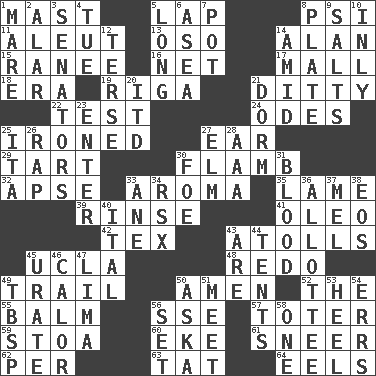 ACROSS 1. Vertical spar for supporting sails 5. Infant locale 8. Air pressure measure (abbr.) 11. Eskimo relative 13. Bear (Spanish) 14. Actor Alda or Thicke 15. Indian princess (variant) 16. Fish or hair follower 17. Shopping center 18. Epoch 19. Port city in Latvia 21. Simple song 22. Trial 24. Lyric poems 25. Pressed 27. Ewer handle 29. Small pie 30. Flambe (short form) 32. Domed church section 33. Scent 35. Unable to walk 39. Remove soap 41. Butter sub 42. John Ritter's dad 43. Ringlike coral islands and reefs 45. Southern CA. univ. 48. Make new 49. Lag or linger behind 50. So be it 52. Definite Article 55. Lip ointment 56. Compass dir. 57. Carrier 59. Portico 60. Make supply last 61. Scornful expression 62. For each 63. Make lace 64. Snakelike fish DOWN 1. Female horse 2. Having or resembling wings 3. Elected representatives 4. Third day of the wk. 5. Protracted 6. Toward the sea 7. Cooking vessel 8. Food holder 9. Table seasonings 10. Inwardly 12. Laconic 14. Among 20. It would 21. Dormintory (informal) 23. Keyboard key 25. Call ___ day 26. Reproach for some lapse or misdeed 27. Shade tree 28. American Automobile Association (abbr.) 30. Enemy 31. Vital fluid 33. One (Scot) 34. Acura sports coupe 36. One to whom something is allotted 37. Cartoonist voice _ Blanc 38. Greek goddess of the dawn 40. Slanted text style (abbr.) 43. "We ___ not amused" (Victoria) 44. Portable shelters 45. A salt of uric acid 46. Bodily heat indicating an inflammation 47. Pale green bean 49. Cook's measure (abbr.) 50. "____ silly question..." 51. Confront 53. The bottom of a shoe or boot 54. Blunders 56. Put into a specified state 58. Single