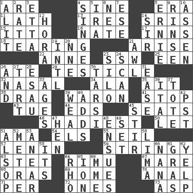ACROSS 1. "We ___ not amused" (Victoria) 4. Trig term 8. Period 11. Thin strip of wood or metal 13. Angers 14. Indian titles of respect 15. "Tell ____ the Marines!" 16. Nathan's nickname 17. Restaurants 18. Pulling apart 21. Ascend 22. Singer Murray 23. Compass dir. 25. Car or cant ending 26. Had dinner 29. A testis 32. Rhinal 34. In the manner of 35. Small island 38. To be drawn or hauled along 39. Make _____ (do battle with) 41. Constrict 43. Third day of the wk. 44. Begley and Asner 45. Theater features 46. Most dark, concealed or hidden 50. Allow 51. Nanny (var.) 54. Raised railways 55. Famous astronaut Armstrong 57. Soviet premier 1918-24 59. Slender, wiry 63. Proofreading order 64. Tall New Zealand timber tree 67. Female horse 68. Mouths or openings 69. Dwelling 70. Of or related to the anus 71. For each 72. Singles 73. Viper DOWN 1. Set down 2. Pace 3. Singer James 4. Scorches 5. Lyricist Gershwin 6. Remaining after all deductions 7. Compass dir. 8. Bert's buddy 9. Wash lightly 10. NE Netherlands city 12. Israeli folk dance 14. Title for a knight 19. International (abbr.) 20. Compass dir. 21. Leather borer 23. Grain storage tower 24. Glance over 26. Added to 27. Small pie 28. Son of Isaac 30. Tarsus (plural) 31. Comfort 33. Ripens 36. Slanted text style (abbr.) 37. Carryall 39. Welt 40. Does sums 42. Pacific Standard Time (abbr.) 45. Use a spoon 47. Layer 48. Follows as a consequence or result 49. Put into a specified state 51. Columnist Joseph or Stewart 52. Distance measurement (Brit.) 53. Approach 56. Pale green bean 58. ___ a Wonderful Life 60. Grandmother 61. Pate de foie ____ 62. Sharp bark 64. 17th letter of the Greek alphabet 65. Electrically charged atom 66. Madame (abbr.)