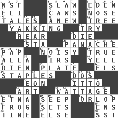 ACROSS 1. Overdraft (abbr.) 4. Cole _ (cabbage dish) 8. Paradise 12. Connecticut Ivy Leaguer 13. Crow sounds 14. Characteristic smell of wine 15. Lies 18. Afresh 19. Relationship diagram 20. Prolonged, sometimes senseless talking 22. Attempt to accomplish something 23. Bring up, as a child 24. Expire 25. R.R. building 26. Flamboyance 30. Infant food 33. Annoyingly loud 36. Loyal 37. Silent film actress Nazimova 39. Big collection agency 40. Shout 41. South Vietnam president (1954) 42. Food holder 44. Raised railways 45. Paper fasteners 47. Two (Sp.) 50. Period of immesurable duration 51. "Tell ____ the Marines!" 53. Tate display 54. Electrical Measurement 57. Inactive volcano in Sicily 59. Ooze 61. Lowest deck of a ship 63. Toadlike animal 64. Puts into a specified state 65. Followers of ems 66. Prong on a fork 67. Otherwise 68. Fast jet (abbr.) DOWN 1. Fish or hair follower 2. Kill 3. Having threads 4. Examine hastily 5. Austrian-born American filmmaker Fritz 6. Deep reverence 7. Compass dir. 8. Plea 9. Dinghy 10. Compass dir. 11. Born 16. Supplements with great effort 17. Three-handed card game 21. SW Asia republic 22. Shallow baking pan 24. 24 hours 26. Inconspicuous attention getter 27. Algonquian 28. Frame or body of a ship 29. Snakelike fish 30. Writing tablets 31. Set down 32. Entreaty 34. Lubricates 35. Lyricist Gershwin 38. Electrical Measurement 42. Fenced enclosure 43. Prepare for publication 46. Car dealer's back yard 48. "Beetle Bailey" pooch 49. Play the lead 52. Stares at amorously 53. At once, immediately (arch.) 54. Soaks 55. Domed church section 56. Immeasurably long periods of time 57. Bank Draft (abbr.) 58. Three (prefix) 59. Compass dir. 60. Snakelike fish 62. Pacific Standard Time (abbr.)