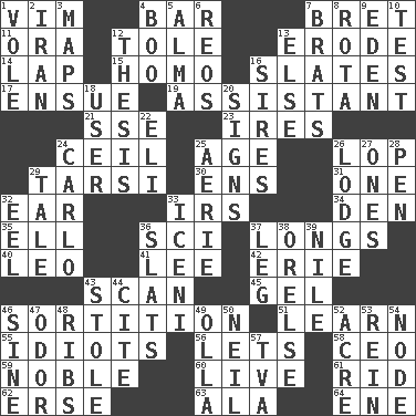 ACROSS 1. Zeal 4. Long, evenly shaped piece 7. Cy Young winner Saberhagen 11. Mouth or opening 12. Lacquered or enameled metalware 13. Eat (away) 14. Pet locale 15. Same (prefix) 16. Chalkboards 17. Follow as a consequence or result 19. Aide 21. Compass dir. 23. Angers 24. To provide with a ceiling 25. Mature 26. Chop off 29. Tarsus (plural) 30. Followers of ems 31. Single 32. Ewer handle 33. Big collection agency 34. Lair 35. Pipe bend 36. _-fi 37. Yearns 40. Lion 41. Area sheltered from the wind 42. 4th largest of the Great Lakes 43. Skim 45. Set 46. Drawing lots 51. Acquire or gain knowledge or skills 55. Foolish or stupid persons 56. Allows 58. Corporate head (abbr.) 59. Having high moral qualities 60. Not recorded 61. To free from 62. Celtic language 63. Insect wing 64. Compass dir. DOWN 1. Short-tailed, large-bodied rat 2. SW Asia republic 3. Atlas contents 4. Sometimes accompanies a hiss 5. _ mater 6. Vintage cars 7. Naughty children 8. Roll call or roster of names 9. Genesis locale 10. Trial 12. College paper 13. Otherwise 16. Begets 18. One who uses or employs something 20. Public displays of written messages 22. Biblical high priest 24. Monte _, Las Vegas Hotel/Casino 25. Nest on high 26. Inn 27. Singles 28. Fenced enclosure 29. Story 32. Snakelike fish 33. Ancient Celtic tribe of eastern Britain 36. Narrow boards 37. Part of a journey 38. Threatening words 39. Mediterranean tributary 43. Fur scarf 44. Quote 46. Trig term 47. Aroma 48. Teases 49. Rounded earthenware pot or jar 50. Famous astronaut Armstrong 52. Land measure 53. It's straight from the horse's mouth 54. Connecting point 57. Federal power corp.