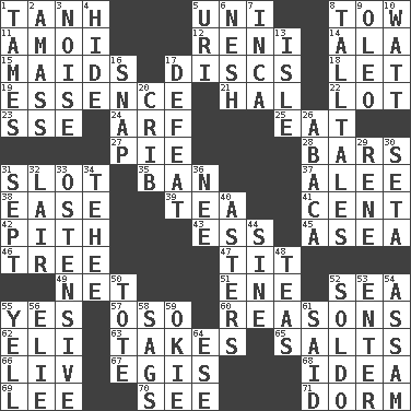 ACROSS 1. Hyperbolic tangent 5. Single; one (prefix) 8. Pull behind 11. Mine, in Marseilles 12. Painter Guido (1575-1642) 14. According to 15. Unmarried girls 17. Flat circles 18. Allow 19. Substance 21. Actor Linden 22. Car dealer's back yard 23. Compass dir. 24. Sandy's bark 25. Ingest 27. Sliced dessert 28. Soap units 31. Notch 35. Bar 37. Toward shelter 38. Relaxation 39. Beverage made from leaves 41. Penny 42. Heart or essence 43. Double-curved letter 45. Toward the sea 46. Woody plant 47. Teat (slang) 49. Remaining after all deductions 51. Compass dir. 52. Ocean 55. Affirmative reply 57. Bear (Spanish) 60. Thinks logically 62. Connecticut Ivy Leaguer 63. Receives possession of 65. Table seasonings 66. 54 in ancient Rome 67. Armor plate that protects the chest 68. The content of cognition 69. Area sheltered from the wind 70. Observe 71. Dormintory (informal) DOWN 1. Domesticates 2. Collect or gather 3. Annoying sound 4. Flintstone garb 5. RI univ. 6. Tender 7. South American Indian 8. Baron Munchausen's specialties 9. Margarine 10. Electrical Unit 13. Small island 16. Fastener 17. Outscore 20. Baby bed with high sides 26. Phillipine bananalike plant 29. French philosopher Descartes 30. Stalk of a moss capsule 31. Back-to-school mo. 32. Den 33. Clearly or manifestly demonstrative 34. Giggle 36. Born 40. Michaelmas daisies 44. Trig term 48. Afternoon social gatherings 50. Lug 52. Twentieth part of a lira 53. Keyboard key 54. Indian state 55. Shout 56. Writer Wiesel 58. Sinks 59. Migrant worker of the '30s 61. Expressed in words 64. Compass dir.