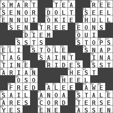 ACROSS 1. Don Adams' spy role 6. Afternoon social gathering 9. To sift 12. Sir (Sp.) 13. Dunce 14. Stitch closed the eyes of (a falcon) 15. World-weariness 16. Migrant worker of the '30s 17. Frame or body of a ship 18. Elected rep. 19. Woody plant 20. Immeasurably long periods of time 21. South Vietnam president (1954) 23. Fr. "Yes" 24. Fast planes 25. Ceases 28. Biblical high priest 30. Fur scarf 34. Fastener 35. Label 36. Virtuous person 38. _ tizzy (2 wds.) 39. Prong on a fork 41. Amusement-park features 43. Fast jet (abbr.) 44. Believer in; advocate of (suffix) 46. Command 48. Bear (Spanish) 49. Person who is morally reprehensible 50. Flintstone 51. Toward shelter 53. Deep reverence 56. Travel by water 57. Small Philippine buffalo 58. Having lost freshness 60. Ancient Greek god of war 61. Drawstring 62. Laconic 63. Affirmative reply 64. Compass dir. 65. NE Netherlands city DOWN 1. Compass dir. 2. Not women's 3. Singer Murray 4. Periods in a boxing match 5. Three (prefix) 6. Casino tip 7. Writer Wiesel 8. Had dinner 9. One who advocates reunion 10. Snakelike fish 11. Pipe bend 13. Dormintory (informal) 14. Yells 19. Trials 20. Greek goddess of the dawn 22. It is 24. Seigniories (variant) 26. Baking dishes 27. Petty quarrel 28. Singer James 29. Den 31. Rowing implement 32. Cards in a Roman deck? 33. Conclusion 37. Giggle 40. Artist's stands 42. Observe 45. Allow head to fall sleepily 47. Chalkboards 49. Froth on beer 50. Conductor's collection 51. Soon (poet.) 52. Old wives' tales, e.g. 54. Armed conflicts 55. Otherwise 56. Declare 57. Adept person 58. R.R. building 59. Car or cant ending