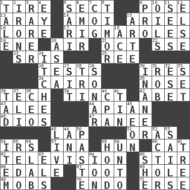 ACROSS 1. Become fatigued 5. Religious group 9. Introduce or present, as a question 13. Like ___ of sunshine 14. Mine, in Marseilles 15. Satellite of Uranus 16. Old wives' tales, e.g. 17. Frustrating wastes of time 19. Compass dir. 20. Wind 21. Sep. follower 22. Compass dir. 23. Indian titles of respect 25. To separate or throw off 26. Trials 30. Angers 34. Capital of Egypt 35. Characteristic smell of wine 36. Technology 39. Tinged 42. Collude with 43. Toward shelter 44. Bee-related 46. "Vaya con ____" 47. The wife of a rajah (variant) 48. Infant locale 51. Mouths or openings 54. Big collection agency 57. _ tizzy (2 wds.) 58. Attila the _ 60. Domesticated feline 62. Household entertainment appliance 65. Use a swizzle stick 66. Peak District village in England 67. A blast of a horn 68. Opening into or through something 69. Disorderly crowds 70. Inside; within (prefix) 71. Celtic language DOWN 1. Story 2. Removes the wrinkles 3. More valued for its uncommonness 4. Sight organ 5. Indian skirt 6. Arab leader 7. Gear tooth 8. The easternmost of the Lesser Sundas 9. Adept person 10. Lubricates 11. Perceives with the eye 12. Otherwise 15. Johnson of "Laugh-In" 18. Adept person 20. Toward the sea 24. Skin irritations 27. Be seated 28. Three (prefix) 29. Underwater navigation system 30. Sillier 31. Director Reiner 32. Compass dir. 33. Arrange properly for use 36. Small amount or degree 37. Connecticut Ivy Leaguer 38. Corporate head (abbr.) 40. Accounting whiz (abbr.) 41. Metal container 45. A really long time 48. Not recorded 49. Black tropical American cuckoo 50. Thick mixture 52. Thespian 53. Moves on water 54. Detail 55. Do over again 56. Broad, flat, thick piece 58. Parka part 59. To (old English) 61. Relationship diagram 63. Raised railways 64. Electrically charged atom 65. A female animal or person