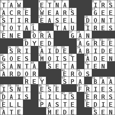 ACROSS 1. The 23rd letter of the Hebrew alphabet 4. Inactive volcano in Sicily 8. Big collection agency 11. 1/640 square mile 13. Puts on (as clothing) 15. Unit of force equal to gravity 16. Tumult 17. Artist's stand 18. Do not 19. "_____ Recall" 21. The 19th letter of the Greek alphabet 22. Angers 23. Compass dir. 24. Mouth or opening 27. Separate the seeds from cotton 29. Colored 30. Match 34. Indian title of respect (Mr.) 36. Helper 39. Stay 40. Travels 41. Damp 43. An important port of Yemen 44. Before Barbara or Clara 46. Stalk of a moss capsule 47. "___ Little Indians" 48. Zeal 49. Greek god of love 51. Marina Del _, California 53. Health resort 54. Sound made by sheep 57. Is not 60. Compass dir. 63. Strips of potato fried in deep fat 65. Raised platform 66. Ms. Damita and namesakes 69. Blunders 70. Pipe bend 71. Thick mixture 72. Singer Brickell 73. Had dinner 74. Ancient Persian 75. Elected rep. DOWN 1. Clothes sense 2. NE Massachussets city 3. Compose 4. She-sheep 5. Afternoon social gathering 6. Political cartoonist Thomas 7. Length times width 8. Russian composer Stravinsky 9. French philosopher Descartes 10. Arranges properly for use 12. Period 14. Strike heavily 18. Empty-headed or silly people 20. Myrna of the movies 25. 480, 500 or 516 sheets of paper 26. Goodbye (Sp.) 28. Auto club (abbr.) 29. What propaganda does 31. Travel on an animal 32. Paradise 33. Car or cant ending 34. Fly high 35. Tear apart 37. Pass on 38. _____ Park, CO 40. Girls' org. (abbr.) 42. Canvas cover 45. "We ___ not amused" (Victoria) 50. Clumsy lout 52. Sharp bark 54. Avian creatures 55. Nest on high 56. NE Netherlands city 57. The main thing one is thinking about 58. Table seasoning 59. Mediterranean tributary 61. Thailand, formerly 62. Otherwise 64. To riddle 67. It would 68. Perceive with the eye