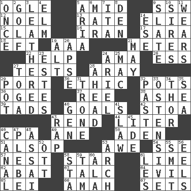 ACROSS 1. Stare 5. Among 9. Compass dir. 12. Christmas carol 13. Pace 14. Writer Wiesel 15. Dollar (slang) 16. SW Asia republic 17. "Two Mules for Sister ____" 18. Lizard (obsolete) 19. American Automobile Association (abbr.) 21. Distance measurement 22. Aid 24. Nursemaid (var.) 26. Curvy letter 27. Trials 28. Like ___ of sunshine 29. Sweet dark-red dessert wine 30. Principle of right and wrong 32. Plant holders 36. Double curve, resembling the letter S 37. To riddle 38. American tennis player Robert 39. Small amounts or degrees 40. Scores awarded for successful feats 42. Portico 43. Tear apart 44. 61 cubic inches 46. Tax preparer (abbr.) 49. A saturated hydrocarbon 50. Arabian gulf 51. Columnist Joseph or Stewart 53. Deep reverence 54. Compass dir. 57. Egg locale 58. Play the lead 61. Citrus frut 62. Blind as ____ 63. Baby powder 64. Morally bad or wrong 65. Flowery wreath 66. Nursemaid 67. Puts into a specified state DOWN 1. Single time 2. _ course 3. Tough but pliablecoriaceous 4. Shade tree 5. Roberta Peters solo 6. Third mo. 7. Call ___ day 8. Lair 9. Chalkboard 10. Founders of families 11. Puts on (as clothing) 14. Compass dir. 19. The first octave above the treble staff 20. Domed church section 21. Fifth month 23. _____ Park, CO 24. Satellite of Uranus 25. Apple computer (short form) 27. Ancient Roman robe 28. Forward in time 29. Plant holder 31. Heavy duty weighing machine 32. Thick mixture 33. Clearly or manifestly demonstrative 34. Son of Odin 35. Ocean 40. Commissioned mil. rank 41. Cole _ (cabbage dish) 43. Hit sharply and swiftly 45. Binary compound 46. Lessep's creation 47. First-year military academy student 48. Slender Brazilian palm 52. Baseball player Mel 53. Bowlike part 55. Stricken, poetically 56. Snakelike fish 58. R.R. building 59. Scottish cap 60. Wing 61. French article