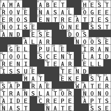 ACROSS 1. Nanny (var.) 4. Collude with 8. Command 12. Be footloose 14. Relating to the nose 16. Double curve, resembling the letter S 17. Greek god of love 18. Pleas 20. Annoying sound 22. Single 23. Fast jet (abbr.) 24. Also 25. Compass dir. 28. Two (Sp.) 30. Having or resembling wings 31. Trap for birds or small mammals 35. Set 37. Whine 40. SW Asia republic 41. Implement 42. Odor 44. Put down 45. Painter Guido (1575-1642) 46. Rend 47. Pipe bend 48. Come out of 50. Be inclined (to) 52. Floor covering 54. Supplement with great effort 55. R.R. building 58. Plant excrement 61. Actress Charlotte 63. Wetness 65. Interpreter 70. Words to Nanette 71. Helper 72. Streamer paper 73. Tenement units (abbr.) 74. Political cartoonist Thomas 75. Nathan's nickname 76. Compass dir. DOWN 1. Sports stadium 2. Person of subnormal intelligence 3. Keep away from 4. A saturated hydrocarbon 5. Forbid 6. Eastern Standard Time (abbr.) 7. Pacific island yam 8. Being at a high temperature 9. Armor plate that protects the chest 10. Observes 11. Trial 13. Curvy letter 15. Grant temporary use of 19. A really long time 21. Snakelike fish 26. Plant excrements 27. Spew [out] 29. Dirtied 30. Plant genus of onion and garlic 32. Relating to the mouth 33. Move on water 34. Conclusion 35. Moves 36. Immeasurably long periods of time 38. Area sheltered from the wind 39. Related on the mother's side 41. Three (prefix) 43. Long journey 49. Hearing organs 51. ___ Haven, CT 53. Baby powder 55. Discontinues 56. Portable shelters 57. Came up 58. Comedian Laurel of Laurel & Hardy 59. Roberta Peters solo 60. Groovy apts. 62. Merit 64. Santa ___, CA 66. Remaining after all deductions 67. Afternoon social gathering 68. Choose 69. To separate or throw off