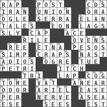 ACROSS 1. Strike 4. Mail 8. Music discs 11. SW Asia republic 13. The state of being joined or united 15. Mouth or opening 16. Stare at amorously 17. Father Junipero _ 18. Style 19. Lies 21. Period of immesurable duration 22. Fails to keep up a pace 23. Playfully artful 24. Head covering 27. Adept person 29. Cause heat under the collar 30. Baking chambers 34. Portuguese money of account (variant) 36. Inactive volcano in Sicily 39. Mexican monetary units 40. Simple or foolish person 41. Dice game 43. Political cartoonist Thomas 44. Goodbye (Sp.) 46. Legendary monster 47. Third day of the wk. 48. _ dish (used to culture cells) 49. Hankering 51. Three (prefix) 53. Infant locale 54. Gear tooth 57. Heavy book 60. Large container 63. Approach 65. Scent 66. Satellite of Uranus 69. Relaxation 70. For each 71. Boldness 72. Toward the sea 73. Compass dir. 74. Perceives with the eye 75. Eastern Standard Time (abbr.) DOWN 1. Disturbances 2. Therefore, facetiously 3. Chummy 4. Product of festering 5. Single 6. Father 7. "Corrida" creature 8. Root beer relative 9. To trail on the ground 10. Without 12. Born 14. Grandmother 18. Veterans Day date 20. _-fi 25. Actor Baldwin 26. Stone: prefix 28. Police officer (slang) 29. News announcer 31. He sold his birthright 32. Characteristic smell of wine 33. Fast jet (abbr.) 34. Travel on an animal 35. Send forth 37. Tired old horse 38. Showery time 40. Plant excrement 42. Stalk of a moss capsule 45. Title for a knight 50. Numbers guy (abbr.) 52. _ the terrible 54. Desist 55. Fertile tracts in a desert 56. Relatively large 57. Drink excessively 58. Lyric poems 59. Greater amount 61. Ancient Greek god of war 62. Become fatigued 64. Teachers' org. 67. First lady 68. French article