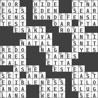 ACROSS 1. Not either 4. Flintstone garb 8. Inactive volcano in Sicily 12. Armor plate that protects the chest 14. Paradise 15. Dry up 16. Elected reps. 17. Unrelated to defense, as in spending 20. Trial 21. Boat paddle 22. Parent Teacher Association (abbr.) 23. 1973 Nobel Price Winner (Physics) Leo 27. Be footloose 29. Polynesian shrub of the pepper family 31. Opposed to 34. Brizilian seaport 35. In a ____ (agitated or irritated) 36. Do over again 39. Tired old horse 41. Snake ____ (dice throw) 42. Ancient Greek god of war 43. Softens 46. Diluted with white 47. Singer James 48. American tennis player Robert 51. _____ Park, CO 54. Arrange properly for use 56. Santa ___, CA 58. 90 degrees 61. The property of being fit to eat 66. _ and Stitch 67. Small Philippine buffalo 68. Supplements with great effort 69. Snaillike creature with no shell 70. Austrian-born American filmmaker Fritz 71. Left 72. Ocean DOWN 1. Egg locale 2. Double curve, resembling the letter S 3. Wash lightly 4. Layer 5. Wedding promise 6. Lair 7. Inside; within (prefix) 8. Compass dir. 9. 3-inch nail 10. Political cartoonist Thomas 11. Length times width 13. Fast planes 18. Ewer handle 19. Away 24. Alias (abbr.) 25. Krazy ___ of comics 26. "Terrible" tsar 28. Flower holders 30. Having winglike extensions 32. Make a knot 33. ___ a Wonderful Life 34. Olfactory organs 36. Strike 37. Epoch 38. Conveyance 40. Yard entry 44. Mountains (abbr.) 45. Erode 49. Actor Linden 50. Compass dir. 52. Snakelike fish 53. Moves on water 54. Lick closed 55. Pulitzer Prize-winning author Ferber 57. Afresh 59. Turn sharply 60. Ancient Roman robe 62. Paper or plastic container 63. Make supply last 64. Elected rep. 65. Fast jet (abbr.)