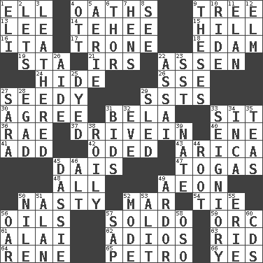 ACROSS 1. Pipe bend 4. Expletives 9. Woody plant 13. Area sheltered from the wind 14. Giggle 15. Land elevation 16. Call ___ day 17. Heavy duty weighing machine 18. Dutch treat 19. R.R. building 21. Big collection agency 22. NE Netherlands city 24. Flintstone garb 26. Compass dir. 27. Sleazy 29. Fast planes 30. Match 31. Actor Lugosi 33. Be seated 36. Actress Charlotte 37. Popular '50s hangout 40. Compass dir. 41. Find the sum of 42. Wrote a lyric poem 43. N. Chile seaport 45. Raised platform 47. Ancient Roman robes 48. Everything 49. A really long time 50. Characterized by obscenity 52. Third mo. 54. Neckwear 56. Lubricates 57. Twentieth part of a lira 59. The grampus (Milton) 61. Jai ____ 62. Goodbye (Sp.) 63. To free from 64. French philosopher Descartes 65. Stone: prefix 66. It is so DOWN 1. Biblical high priest 2. Allows 3. Resembling or made to resemble leather 4. Baseball player Mel 5. Nest on high 6. Son of Odin 7. Coop moms 8. Observe 9. College papers 10. Travel on or in a vehicle 11. Enthusiasm 12. Shade tree 20. Helper 22. Slender Brazilian palm 23. Fast jet (abbr.) 25. Colored 27. "Two Mules for Sister ____" 28. Mild oath 29. Downhill vehicle 31. Auction offers 32. First lady 33. Signiory (variant) 34. South American Indian 35. Afternoon social gatherings 38. Agitated, as a liquid 39. Nathan's nickname 44. Carrot, for example 45. Hyrax 46. Keyboard modifier key 49. Zeal 50. "Death on the ____" 51. Actor Alda or Thicke 52. Method 53. Came down and settled, as after flight 55. 4th largest of the Great Lakes 56. Boat paddle 57. Plant excrement 58. Bear (Spanish) 60. Music discs