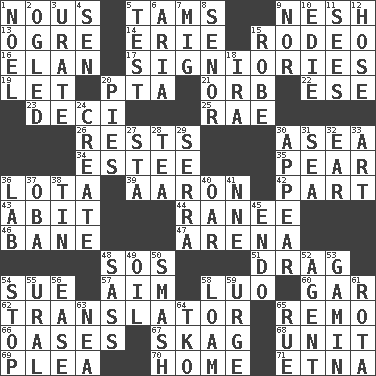 ACROSS 1. Common sense 5. Scottish caps 9. Tender 13. Legendary monster 14. 4th largest of the Great Lakes 15. Cowboy competition 16. Flair 17. Seigniories (variant) 19. Allow 20. Parent Teacher Association (abbr.) 21. Globe 22. Compass dir. 23. Tenth: prefix 25. Actress Charlotte 26. Musical pauses 30. Toward the sea 34. First name in cosmetics 35. Lightbulb-shaped fruit 36. Globular water bottle used in Asia 39. Composer Copland 42. Role in a play 43. "This won't hurt ____!" 44. Indian princess (variant) 46. Object of repulsion 47. Sports stadium 48. Distress signal 51. To be drawn or hauled along 54. Institute legal proceedings 57. Direct toward a target or goal 58. Nilotic language 60. Slender fish 62. Interpreter 65. San ____ (Riviera town) 66. Fertile tracts in a desert 67. Heroin 68. A single undivided whole 69. Entreaty 70. Dwelling 71. Inactive volcano in Sicily DOWN 1. Christmas carol 2. Stared at amorously 3. A salt of uric acid 4. Elected rep. 5. Trial 6. Roberta Peters solo 7. Russian fighter aircraft 8. Sir (Sp.) 9. Not either 10. Singer Brickell 11. Perceives with the eye 12. Stockings 15. Loose flowing garment 18. Retirement account (abbr.) 20. Sliced desserts 24. Cause to be 27. R.R. building 28. Beverage made from leaves 29. Father Junipero _ 30. Become visible 31. Ocean 32. Hearing organ 33. Tate display 36. Experiment locale 37. Chief or king in Benin or Nigeria 38. Metal container 40. Boat paddle 41. Compass dir. 45. Inside; within (prefix) 48. Backtalk 49. Petroleum 50. Box-office sellout 52. Rep 53. Street urchin 54. Discontinue 55. Mountain range 56. Comfort 58. Rich soil 59. Goad 61. Roll call or roster of names 63. Teachers' org. 64. Ring climax 65. Regret