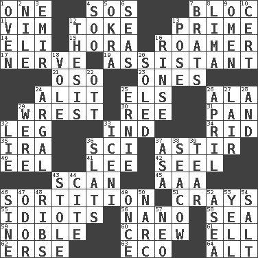 ACROSS 1. Single 4. Distress signal 7. Alliance 11. Zeal 12. Puff or smoke 13. First class 14. Biblical high priest 15. Israeli folk dance 16. Wanderer 17. Boldness 19. Aide 21. Bear (Spanish) 23. Singles 24. Set down 25. Raised railways 26. In the manner of 29. Obtain by seizing forcibly or violently 30. To riddle 31. Baking dish 32. Part of a journey 33. Indiana (abbr.) 34. To free from 35. Lyricist Gershwin 36. _-fi 37. Being in motion 40. Snakelike fish 41. Area sheltered from the wind 42. Sew up the eyelids of hawks and falcons 43. Skim 45. American Automobile Association (abbr.) 46. Conclusion 51. Trading vessels 55. Foolish or stupid persons 56. Billionth: prefix 58. Ocean 59. Impressive in appearance 60. Ship's personnel 61. Pipe bend 62. Celtic language 63. Environmental prefix 64. The first octave above the treble staff DOWN 1. Baking chamber 2. "Death on the ____" 3. Independent ruler or chieftain 4. "Barney Miller" actor Jack 5. Gumbo ingredient 6. Oceans 7. Naughty children 8. Pale green bean 9. Sign of things to come 10. Foregone conclusion 12. College paper 13. Airs 16. Wash lightly 18. Grand slam 20. Having a sole or soles 22. Baseball player Mel 24. Therefore, facetiously 25. Bert's buddy 26. Showery time 27. Den 28. Also 29. We are 32. Falsehood 33. Ancient Celtic tribe of eastern Britain 36. Narrow boards 37. White ___ sheet 38. Manatee 39. Separate forcefully 43. Fur scarf 44. Quote 46. Trig term 47. Aroma 48. Teases 49. At one time in the past 50. Drug cop 52. Toward the sea 53. Shout 54. Table seasoning 57. Modern: prefix
