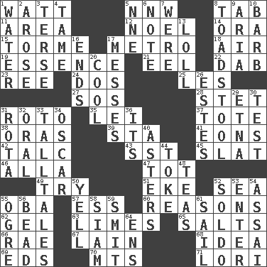 ACROSS 1. Electrical Unit 5. Compass dir. 8. Bar bill 11. Length times width 12. Christmas carol 14. Mouth or opening 15. Singer Mel 17. Paris' subway 18. Wind 19. Substance 21. Snakelike fish 22. Small moist lump or mass 23. To separate or throw off 24. Two (Sp.) 25. French article 27. Mayday 28. Proofreading order 31. Printing process, for short 35. Flowery wreath 37. Carry 38. Mouths or openings 39. R.R. building 41. Immeasurably long periods of time 42. Baby powder 43. Fast jet (abbr.) 45. Narrow board 46. Silent film actress Nazimova 47. Small child 49. Attempt to accomplish something 51. Supplement with great effort 52. Ocean 55. Chief or king in Benin or Nigeria 57. Double-curved letter 60. Thinks logically 62. Set 63. Citrus fruits 65. Table seasonings 66. Actress Charlotte 67. (Had) reclined 68. The content of cognition 69. Begley and Asner 70. Mountains (abbr.) 71. Australian parrot (variant) DOWN 1. Wetness 2. Came up 3. Laconic 4. Not wild 5. Compass dir. 6. Short letter 7. Past tense of be (plural) 8. Inedible or poisonous agaric 9. Operatic vocal solo 10. Sharp remark 13. Hang loosely or laxly 16. Conclusions 17. Makes clutter 20. Calm and collected 26. _____ Park, CO 29. Inactive volcano in Sicily 30. Trial 31. Roll call or roster of names 32. Spoken 33. Baron Munchausen's specialties 34. Witty Wilde 36. ___ a Wonderful Life 40. Michaelmas daisies 44. Casino tip 48. Afternoon social gatherings 50. Shout 52. Twentieth part of a lira 53. Keyboard key 54. Slender Brazilian palm 55. Legendary monster 56. Necklace unit 58. Thailand, formerly 59. Stricken, poetically 61. Move on water 64. Followers of ems