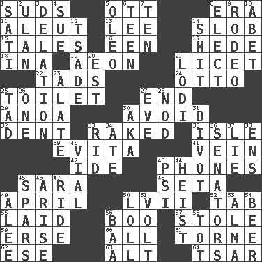 ACROSS 1. Soap bubbles 5. Baseball player Mel 8. Epoch 11. Native American of Southwest Alaska 13. Area sheltered from the wind 14. Messy guy 15. Stories 16. Car or cant ending 17. Ancient Persian 18. _ tizzy (2 wds.) 19. Period of immesurable duration 21. It is permitted: Lat. 22. Small amounts or degrees 24. Von Bismarck 25. Bathroom plumbing fixture 27. Conclude 29. Small Philippine buffalo 30. Stay clear from 32. Undesirable depression on a surface 33. Swept the length of 35. Small island 39. Webber/Rice musical 41. Distinctive style or manner 42. Binary compound 43. Gives a jingle 45. "Two Mules for Sister ____" 48. Stalk of a moss capsule 49. Showery time 50. 57 in ancient Rome 52. Bar bill 55. Put down 56. Sometimes accompanies a hiss 57. Took without asking 59. Celtic language 60. 100% 61. Singer Mel 62. Compass dir. 63. Keyboard modifier key 64. Russian ruler of old DOWN 1. Suttee (variant) 2. Uhlan (variant) 3. Accusation by an informer 4. Take to court 5. Butter sub 6. Adolescent 7. "___ Little Indians" 8. Opt 9. Cowboy competition 10. Collude with 12. Sadhe (variant) 14. Stricken, poetically 20. Eastern Standard Time (abbr.) 21. Farming town in central California 23. Having winglike extensions 25. Bit 26. Single 27. First lady 28. Allow head to fall sleepily 30. Alias (abbr.) 31. A piece of turf (Scot.) 33. To free from 34. Had dinner 36. Elected representatives 37. Whopper 38. Followers of ems 40. Small bottle 43. Air pressure measure (abbr.) 44. Robbery 45. Practice fights 46. Ascend 47. Travel on or in a vehicle 49. Toward shelter 50. Hang loosely or laxly 51. Electrical Unit 53. _ mater 54. Fermented drink made from hops 56. Sound made by sheep 58. Small child
