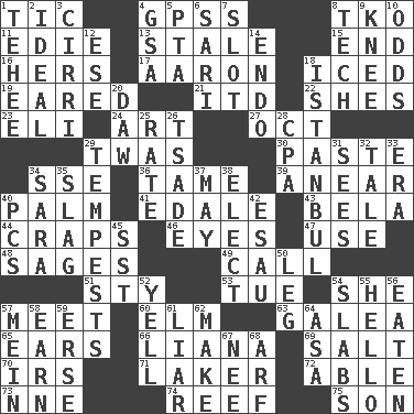 ACROSS 1. Nervous spasm 4. Global Positioning Systems (abbr.) 8. Ring climax 11. Singer Brickell 13. Showing deterioration from age 15. Conclude 16. Possessive pronoun 17. Composer Copland 18. On the rocks 19. Having ears or earlike features 21. It would 22. "______ My Girl" (Turtles hit) 23. Connecticut Ivy Leaguer 24. Nonscientific branch of learning 27. Sep. follower 29. It was, poetically 30. Thick mixture 34. Compass dir. 36. Not wild 39. Approach 40. Inside of hand 41. Peak District village in England 43. Actor Lugosi 44. Dice game 46. Sight organs 47. Purpose 48. Gurus 49. Give a ring to 51. Filthy place 53. Third day of the wk. 54. A female animal or person 57. Rendezvous 60. Shade tree 63. An organ shaped like a helmet 65. Hearing organs 66. Climbing, woody, usually tropical vines 69. Table seasoning 70. Big collection agency 71. Member of a famous L.A. basketball team 72. Competent 73. Compass dir. 74. Coral ridge 75. Manchild DOWN 1. Giggle 2. Standard of perfection 3. High-altitude cloud 4. Girls' org. (abbr.) 5. Parent Teacher Association (abbr.) 6. Indian skirt 7. Position in a hierarchy or organization 8. Technical 9. Leg joint 10. Probability 12. Compass dir. 14. Inside; within (prefix) 18. Byzantium, centuries later 20. Simpleton 25. Assign a rank or rating to 26. Sadhe (variant) 28. Accounting whiz (abbr.) 29. Storms 31. Perceives with the eye 32. Story 33. Epoch 34. "Two Mules for Sister ____" 35. Volcanic refuse 37. Fifth month 38. Voters do this 40. Personal Computers (abbr.) 42. Son of Isaac 45. Fast jet (abbr.) 50. Part of a journey 52. Shout 54. Broad, flat, thick pieces 55. Phone greeting 56. Eroded 57. Count _ (2 wds.) 58. Merit 59. Celtic language 61. One who doesn't tell the truth 62. Cause to be 64. White ___ sheet 67. Born 68. Sandy's bark