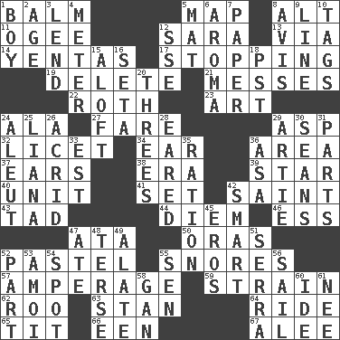 ACROSS 1. Lip ointment 5. Atlas unit 8. Keyboard modifier key 11. Double curve, resembling the letter S 12. "Two Mules for Sister ____" 13. By way of 14. Gossips 17. Discontinuing 19. Keyboard key 21. Makes clutter 22. Writer of Portnoy's Complaint (1969) 23. Nonscientific branch of learning 24. In the manner of 27. Conductor's collection 29. Cleo's killer 32. It is permitted: Lat. 34. Hearing organ 36. Length times width 37. Hearing organs 38. Epoch 39. Play the lead 40. A single undivided whole 41. Put into a specified state 42. Virtuous person 43. Bit 44. South Vietnam president (1954) 46. Double-curved letter 47. _ moment's notice (2 wds.) 50. Mouths or openings 52. Soft color 55. Sounds asleep 57. Electrical Measurement 59. Put through a sieve 62. Friend of Pooh 63. Comedian Laurel of Laurel & Hardy 64. Travel on or in a vehicle 65. Teat (slang) 66. Car or cant ending 67. Toward shelter DOWN 1. Male child 2. Ripen 3. Grant temporary use of 4. Distance measurement 5. Floor covering 6. Scent 7. Some stationery 8. Opinion 9. Actor's bit 10. Labels 12. Compass dir. 15. Upward 16. Stalk of a moss capsule 18. Pacific Standard Time (abbr.) 20. Triads 24. Native American of Southwest Alaska 25. Woody, climbing, usually tropical plant 26. Sour-tasting 28. Having ears or earlike features 29. Nick name for Arthur 30. Seines 31. Actors' quests 33. Eastern Standard Time (abbr.) 35. Food allowance for one day 36. White ___ sheet 42. Don Adams' spy role 45. Greek god of love 47. Had dinner 48. Laconic 49. Having winglike extensions 51. Spanish missionary in California 52. Role in a play 53. Mine, in Marseilles 54. Blemish 55. Elected rep. 56. Move on water 58. Separate the seeds from cotton 60. Binary compound 61. Born